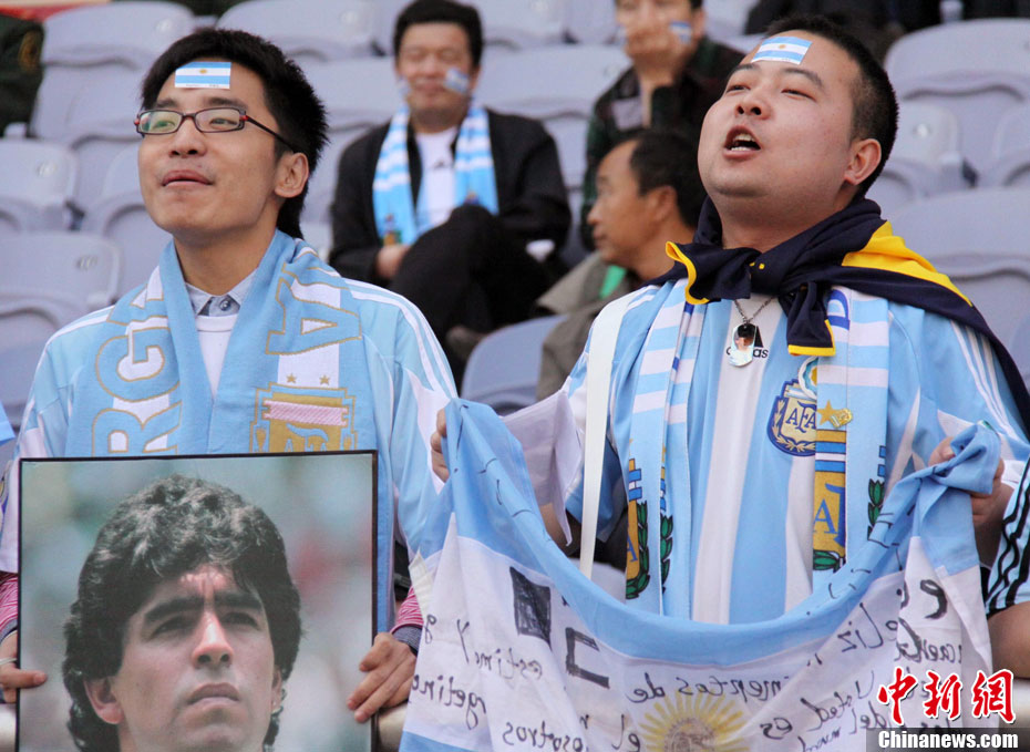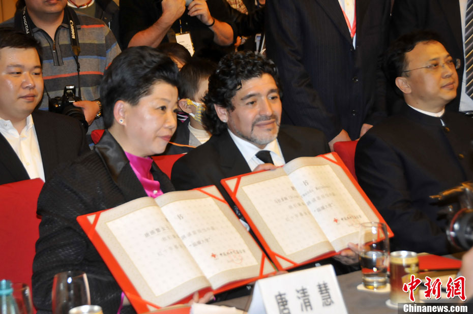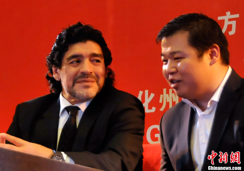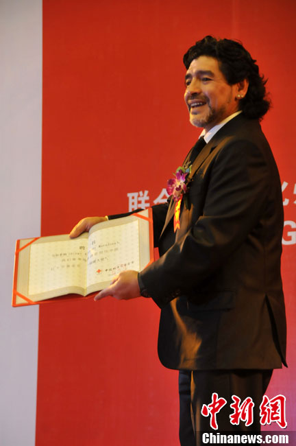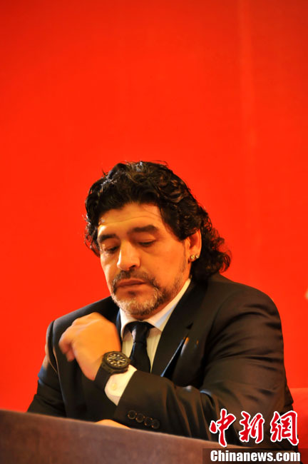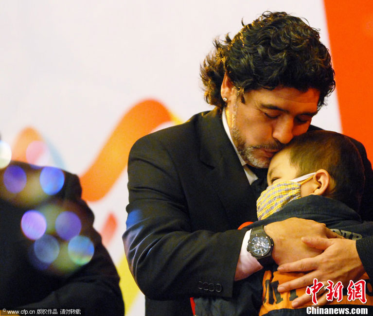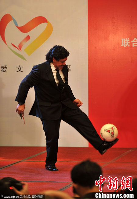 11月5日下午16時左右,世界球王馬拉多納來到山東濟南奧體中心參加山東聯(lián)隊與阿根廷明星隊的慈善比賽。圖為馬拉多納向現(xiàn)場的觀眾和球迷揮手致意。中新社發(fā) 牛杰峰 攝