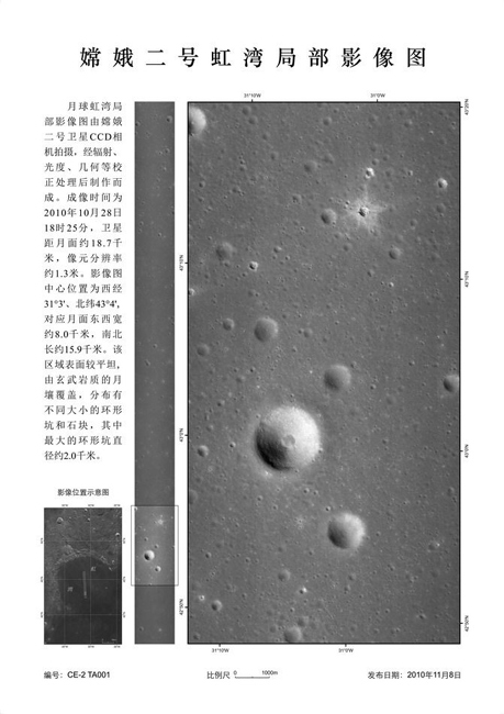 2010年11月8日,中國(guó)國(guó)家國(guó)防科技工業(yè)局首次公布嫦娥二號(hào)衛(wèi)星傳回的月球虹灣區(qū)域局部影像圖。這張?jiān)虑蚝鐬尘植坑跋駡D成像時(shí)間為10月28日18時(shí)25分,衛(wèi)星距月面約18.7公里,分辨率約為1.3米。影像圖中心位置為西經(jīng)31度3分,北緯43度4分,對(duì)應(yīng)月面東西寬約8公里,南北長(zhǎng)約15.9公里。影像圖顯示,該區(qū)域表面較平坦,由玄武巖質(zhì)的月壤覆蓋,分布有不同大小的環(huán)形坑和石塊,其中最大的環(huán)形坑直徑約2千米。影像圖的傳回,標(biāo)志著“嫦娥二號(hào)”任務(wù)所確定的六個(gè)工程目標(biāo)全部實(shí)現(xiàn),四個(gè)科學(xué)目標(biāo)也正在陸續(xù)實(shí)現(xiàn),探月工程二期“嫦娥二號(hào)”工程任務(wù)取得圓滿成功。 中新社發(fā) 國(guó)防科工局供圖