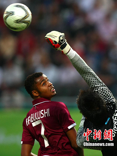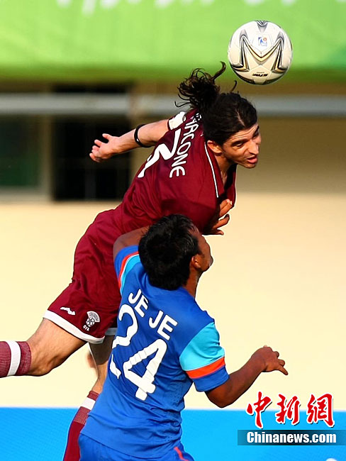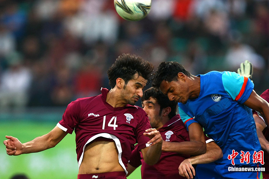 11月9日,第16屆亞運會男足比賽展開D組的一場爭奪,上屆亞運會冠軍卡塔爾隊(紅)在先失一球的情況下實現(xiàn)逆轉(zhuǎn),最終以2:1戰(zhàn)勝印度隊。中新社記者 富田 攝