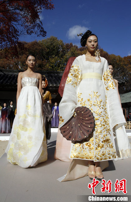 11月9日,韓國首爾昌德宮,模特進行韓服服裝秀的排練。本次服裝秀是G20峰會期間的活動之一。