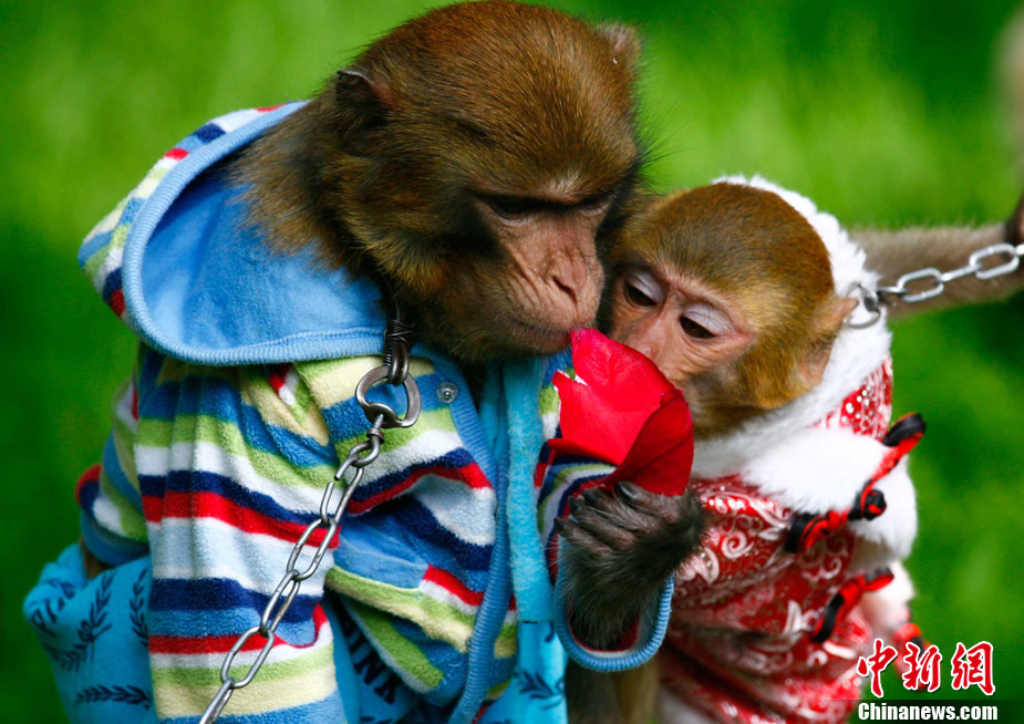 隨著11月11日“光棍節(jié)”的臨近,云南野生動物園忙著在園內(nèi)舉行一次“動物相親大會”,為單身動物們解決終身大事。圖為11月10日,兩只猴子玫瑰花瓣后說“悄悄話”。 中新社記者 劉冉陽 攝