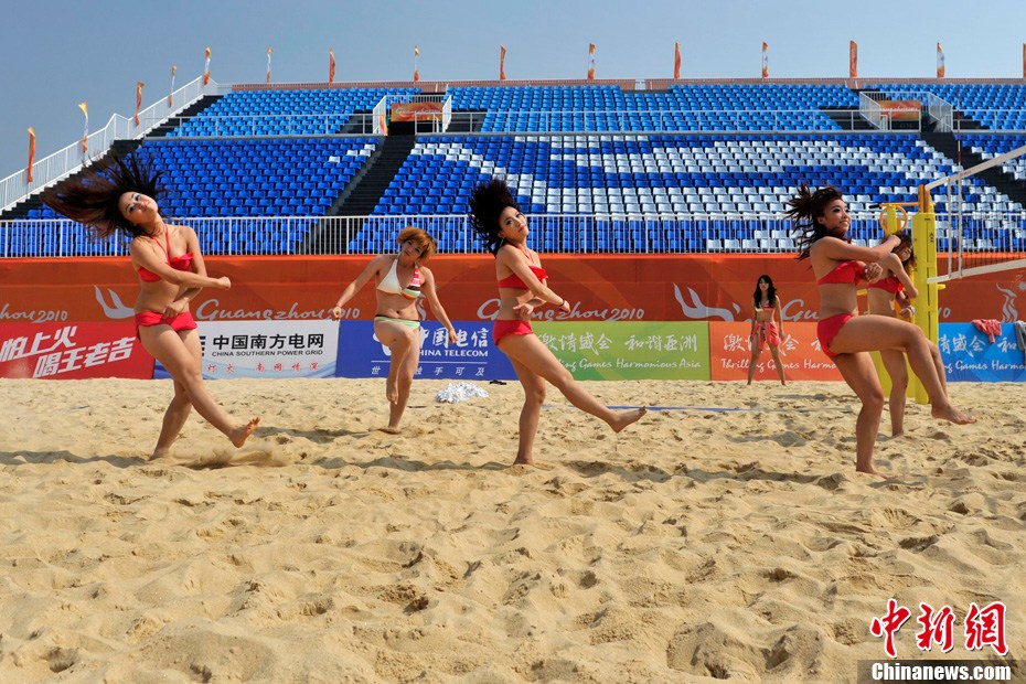 11月11日,熱情洋溢的“沙灘寶貝”身著比基尼在廣州亞運會沙灘排球館主賽場進(jìn)行訓(xùn)練。比賽期間,沙灘排球場將有4支啦啦隊進(jìn)行現(xiàn)場表演。中新社記者 金碩 攝