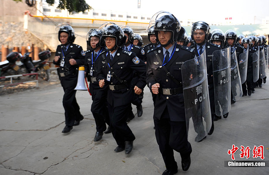 11月11日下午,為提高監(jiān)獄安全防范和及時有效處置突發(fā)事件的能力,廣西監(jiān)獄局組織駐南寧監(jiān)獄單位進行了制暴追逃預案應急處置實戰(zhàn)演練。本次制暴追逃演練是駐南寧市監(jiān)獄單位和武警、公安交警應對突發(fā)事件的首次聯(lián)合大練兵。參與警力達260余人。“事發(fā)監(jiān)獄”在周邊監(jiān)獄單位、武警官兵、公安民警的權利配合下,成功處置4名“罪犯”企圖制造騷亂、趁機越獄脫逃“事件”。中新社記者 蔣雪林 攝