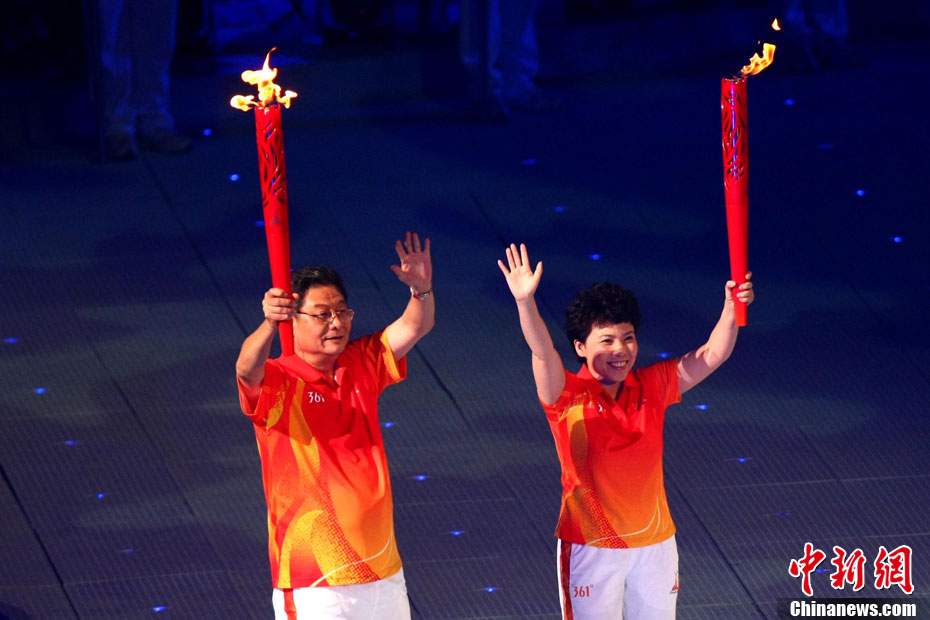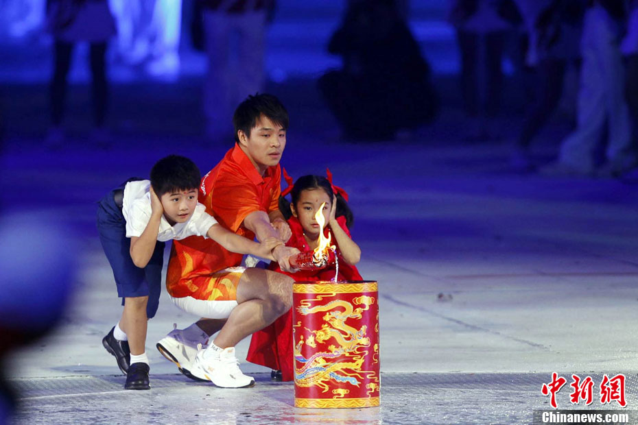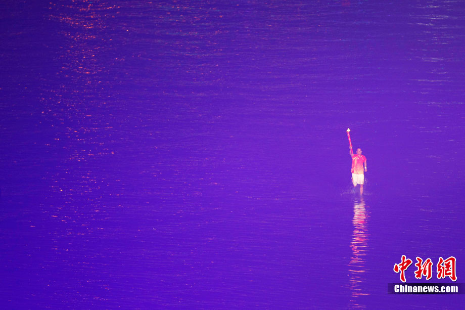 11月12日,廣州亞運(yùn)會(huì)開幕,火炬手持亞運(yùn)圣火跑入會(huì)場(chǎng)。中新社記者 盛佳鵬 攝