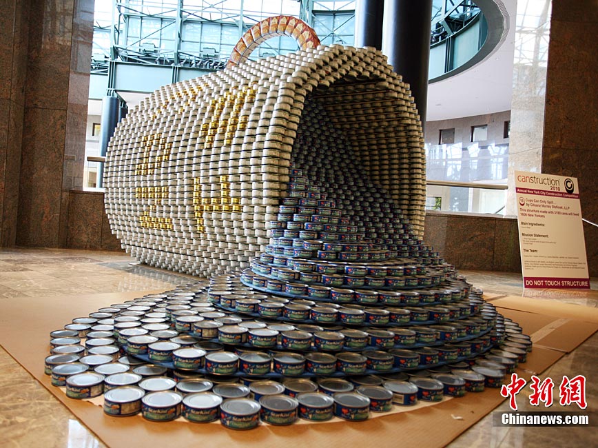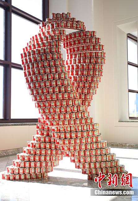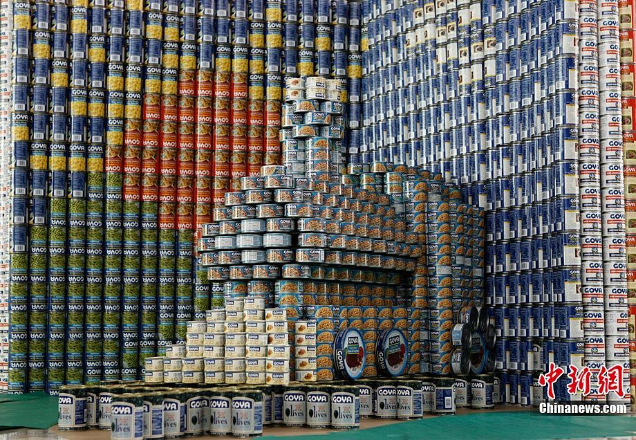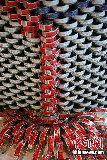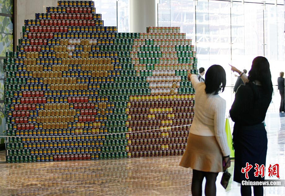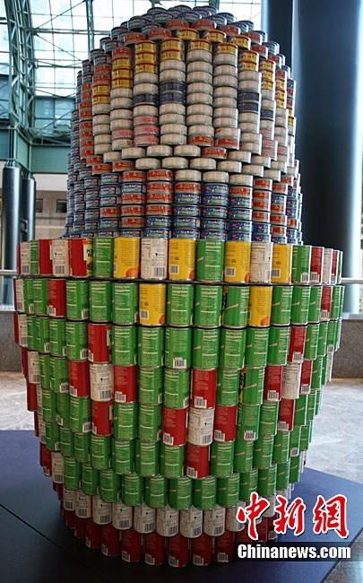 當(dāng)?shù)貢r(shí)間11月11日,美國(guó)紐約世界金融中心的冬園展出了一組用各種食品罐頭組合成的雕塑作品。此次展覽結(jié)束后,這些作品將被拆除,所有的罐頭都將被捐給慈善機(jī)構(gòu)“城市收獲”,用來援助仍在忍受饑餓的人。