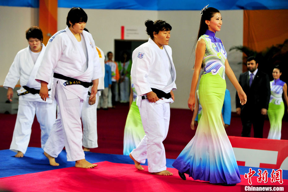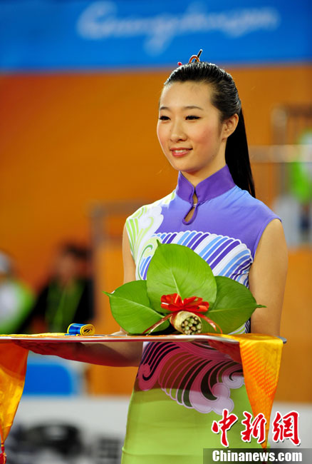 11月13日,2010年廣州亞運(yùn)會(huì)展開了首日的爭(zhēng)奪,漂亮的禮儀小姐紛紛亮相。中新社記者 趙振清 攝