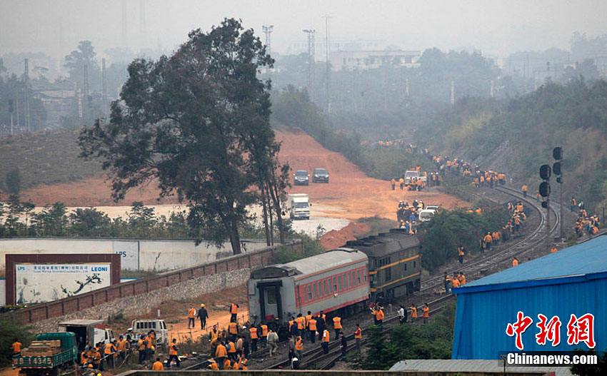 11月15日凌晨3時(shí)許,由北京開(kāi)往湛江的k157次旅客列車在湘桂線柳南到達(dá)場(chǎng)脫軌,事故造成1節(jié)車廂脫軌,無(wú)人員傷亡,不影響行車。據(jù)介紹,脫軌車輛為機(jī)后第五位車廂,目前救援工作已經(jīng)結(jié)束,旅客已安全轉(zhuǎn)移,列車重新編組后繼續(xù)開(kāi)行。事故原因正在調(diào)查中。圖為15日8時(shí)許,列車回歸正常軌道并離開(kāi)事故現(xiàn)場(chǎng)。圖片來(lái)源:CFP視覺(jué)中國(guó)