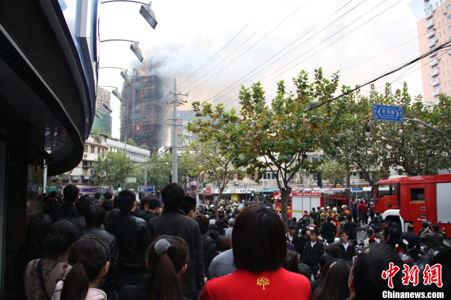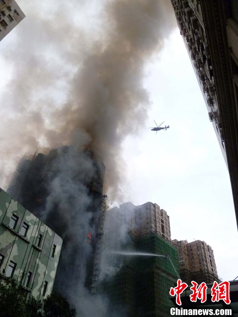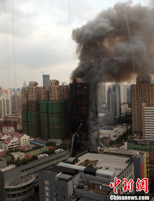 11月15日下午2時(shí)15分,上海中心城區(qū)靜安區(qū)正在進(jìn)行外墻裝修的教師公寓的腳手架起火,火警發(fā)生后,公安民警、消防隊(duì)員迅速趕往現(xiàn)場救援,到場消防車超過10輛。起火原因和損失狀況正在進(jìn)一步調(diào)查中。中新社發(fā) 張嘉森 攝