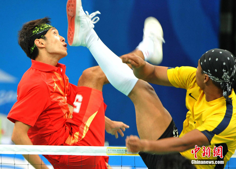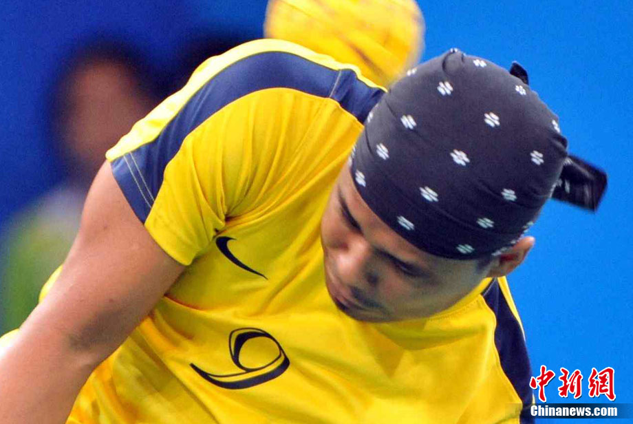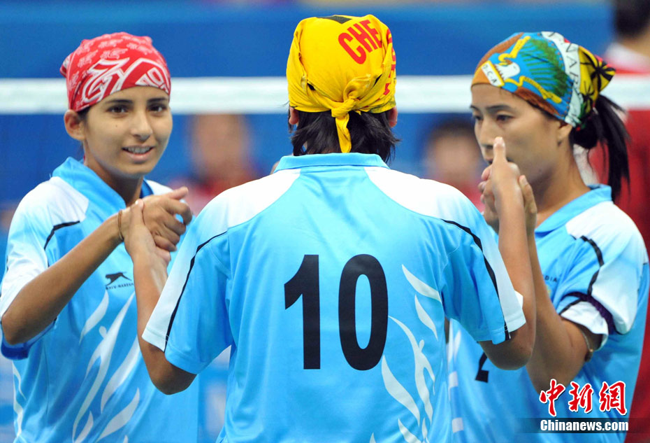 亞運(yùn)藤球賽場(chǎng)上,不少選手喜歡戴頭巾,色彩斑斕的頭巾把運(yùn)動(dòng)場(chǎng)變成了一個(gè)“T臺(tái)秀場(chǎng)”。中新社記者 柯小軍 攝