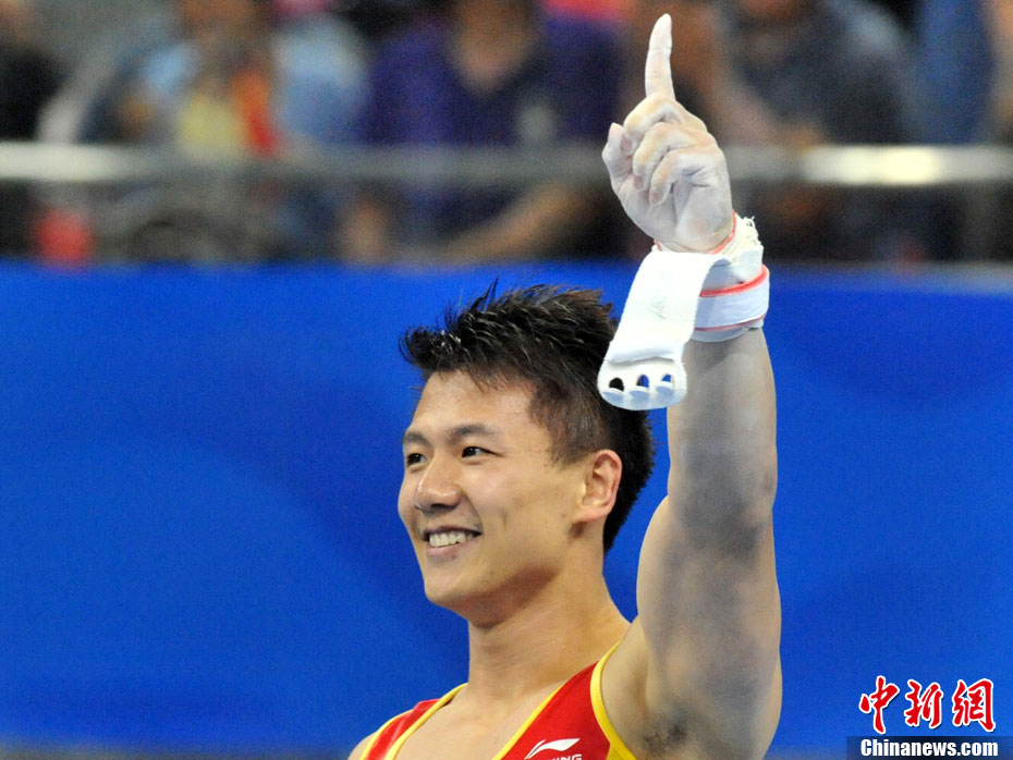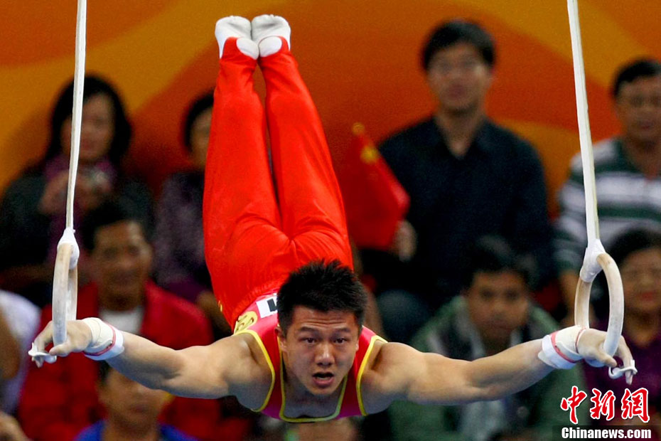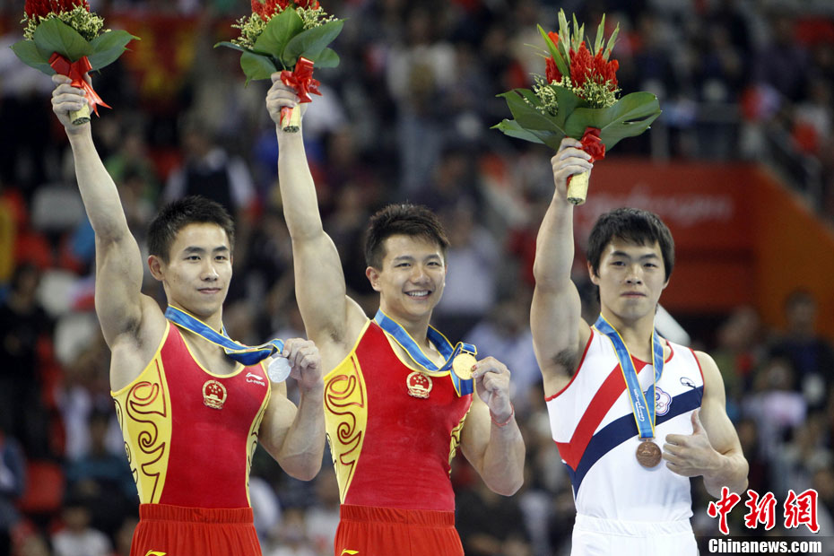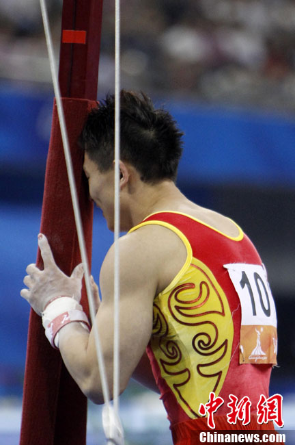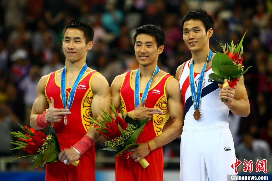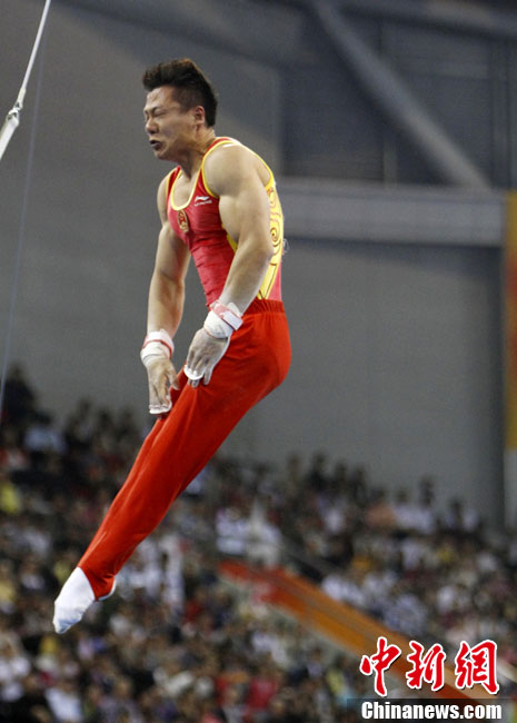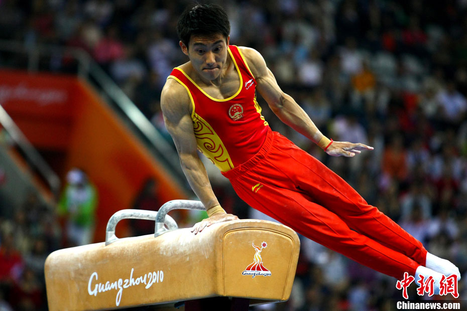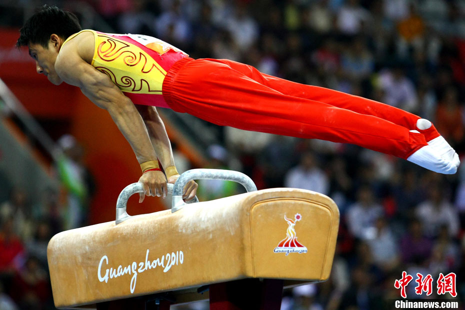11月16日,2010年廣州亞運(yùn)會(huì)體操比賽繼續(xù)在亞運(yùn)城體育館進(jìn)行。在男子鞍馬決賽中,雅典奧運(yùn)會(huì)冠軍、中國名將滕海濱(圖)以15.375分如愿摘金;銀牌被另一位中國選手嚴(yán)明勇獲得,成績(jī)?yōu)?4.726;中華臺(tái)北選手黃哲奎以14.70分排在第三。這已是滕海濱在本屆賽事中,繼男子團(tuán)體和個(gè)人全能之后收獲的第三塊金牌。中新社記者 富田 攝