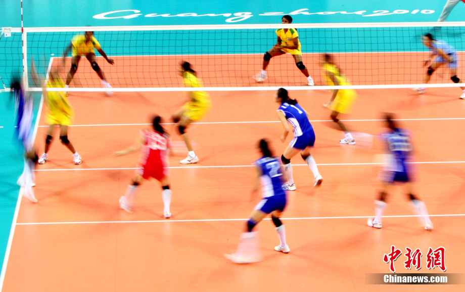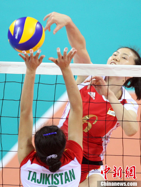 11月18日,廣州亞運(yùn)會女排比賽全面展開,中國隊(duì)首戰(zhàn)迎來塔吉克斯坦隊(duì)。最終,中國隊(duì)在老將周蘇紅的帶領(lǐng)下,以3比0輕松戰(zhàn)勝塔吉克斯坦隊(duì),迎來開門紅。 中新社記者 湯彥俊 攝