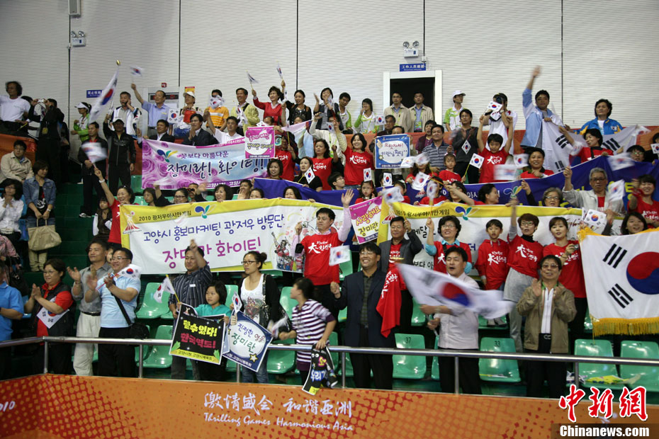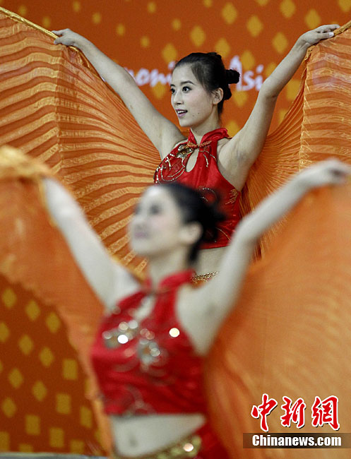 第十六屆廣州亞運(yùn)會各項(xiàng)比賽緊張激烈的進(jìn)行,比賽間隙的美女表演更吸引眼球。中新社記者 趙振清 攝