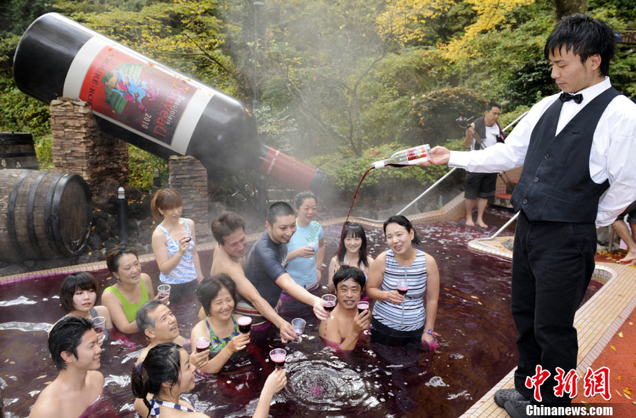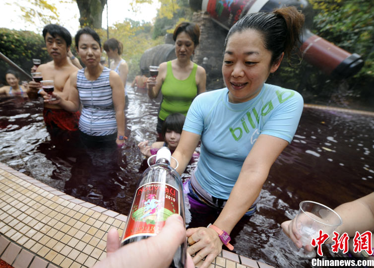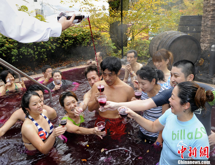 11月18日,一年一度的法國“博若萊”鮮葡萄酒開瓶日到來。由于時(shí)差原因,日本飲者得以先嘗為快。在日本箱根的小涌園溫泉浴場,客人們泡在鮮葡萄酒溫泉中舉杯慶祝。