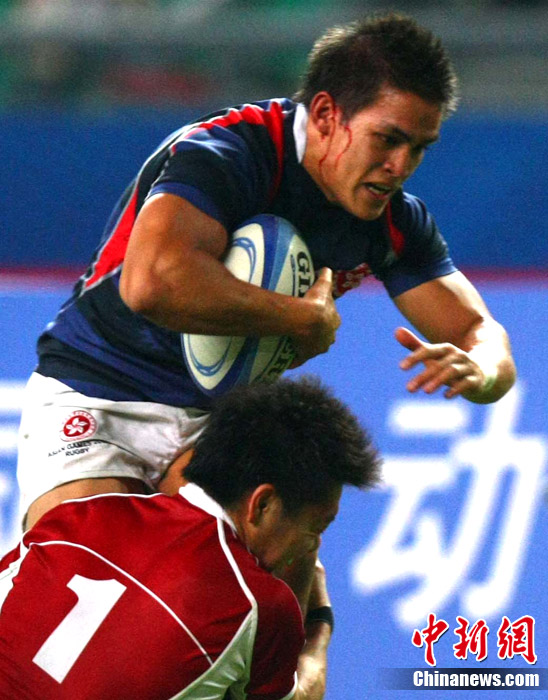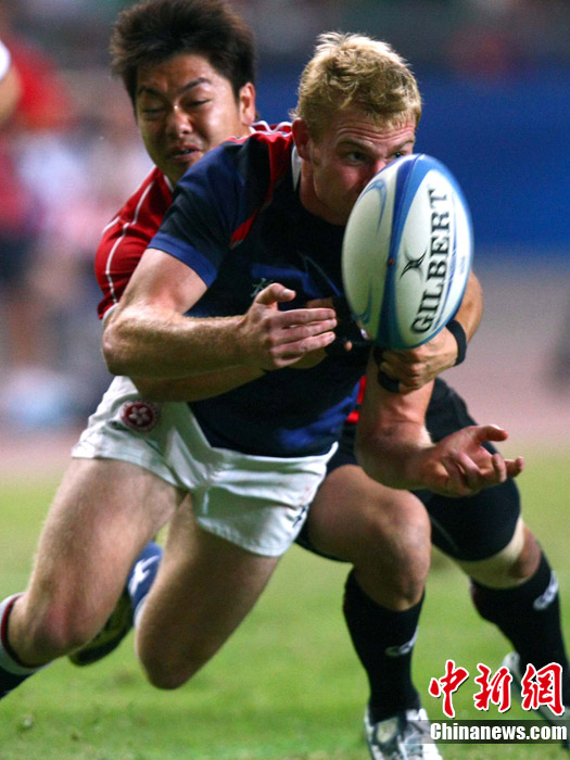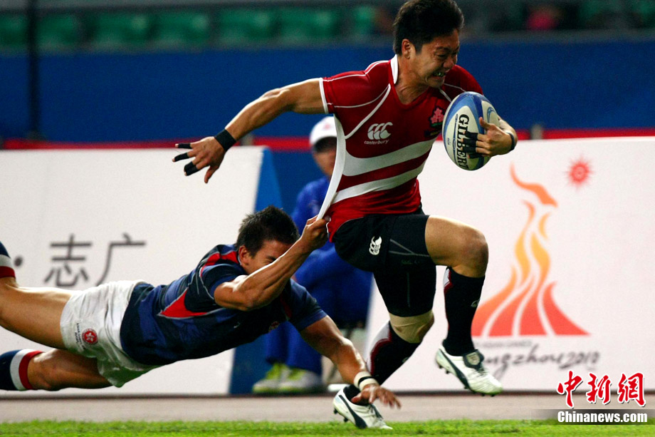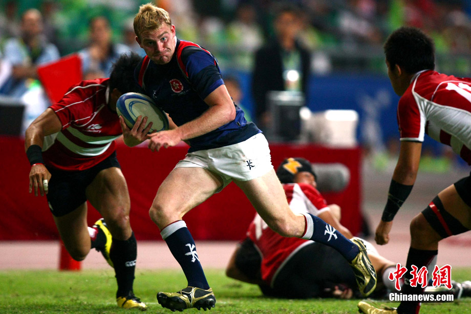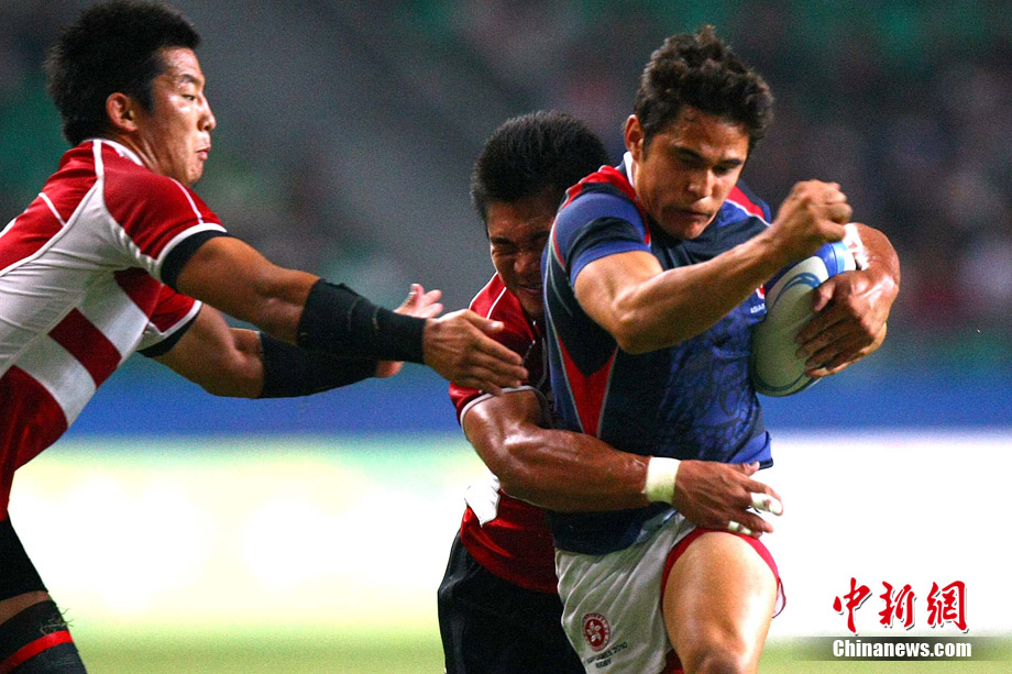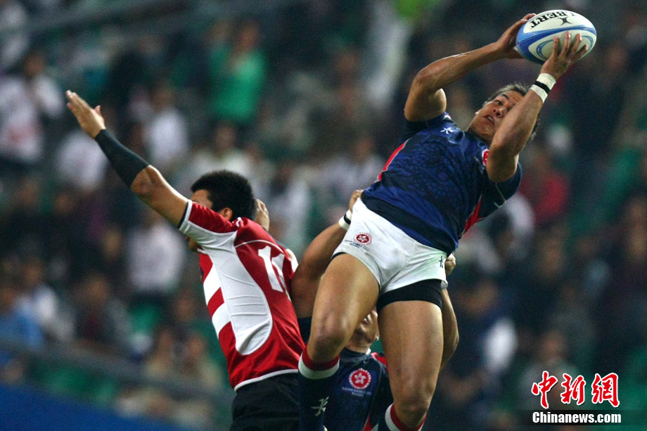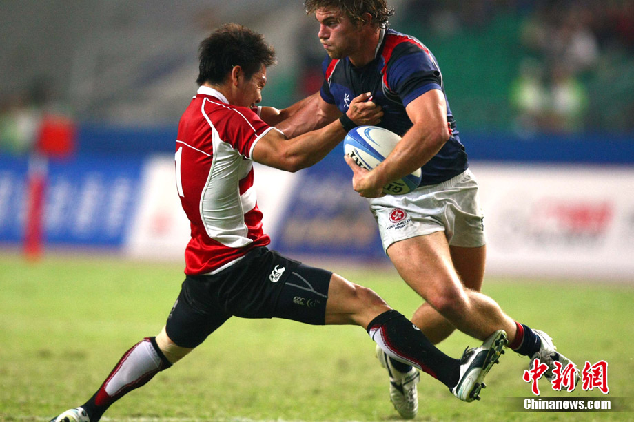 11月23日,廣州亞運(yùn)會(huì)橄欖球賽場(chǎng)結(jié)束了全部賽事的爭(zhēng)奪,在男子組決賽中,中國(guó)香港隊(duì)(藍(lán))以21:28不敵日本隊(duì),獲得一枚銀牌。圖為賽場(chǎng)激烈火爆的精彩瞬間。中新社記者 富田 攝