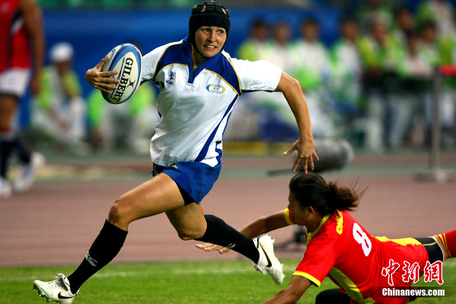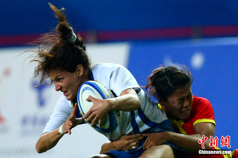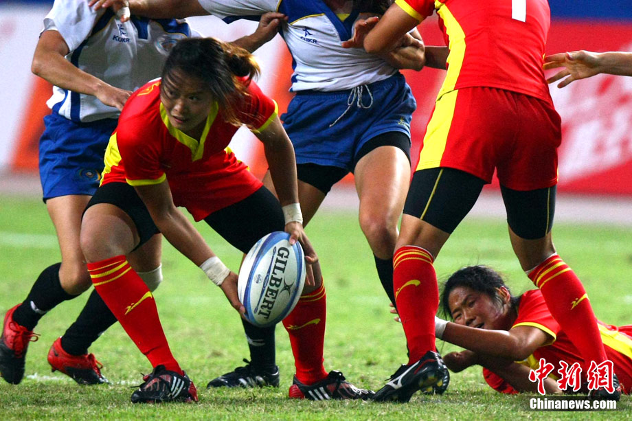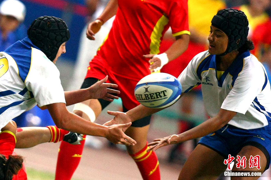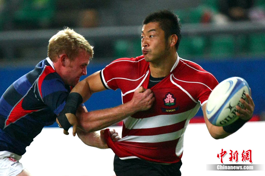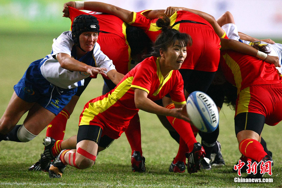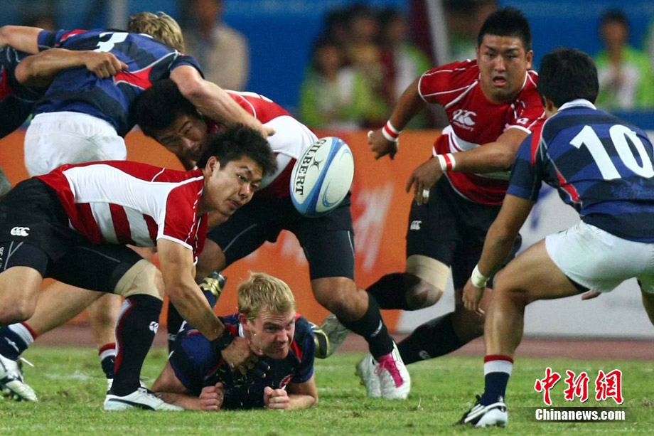 11月23日,廣州亞運(yùn)會(huì)橄欖球賽場(chǎng)結(jié)束了全部賽事的爭(zhēng)奪,在男子組決賽中,中國(guó)香港隊(duì)(藍(lán))以21:28不敵日本隊(duì),獲得一枚銀牌。圖為賽場(chǎng)激烈火爆的精彩瞬間。中新社記者 富田 攝