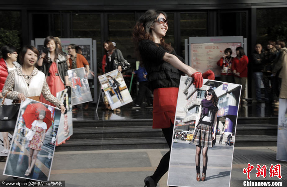 11月23日,在杭州廣場上,百余名身穿時尚服飾,化著個性妝扮的年輕人,手拿自己的靚照,走上街頭,向人們大膽展示自己的風采。右娃 攝 圖片來源:CFP視覺中國
