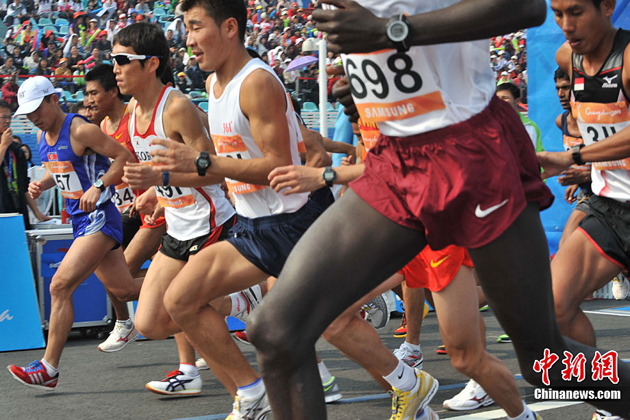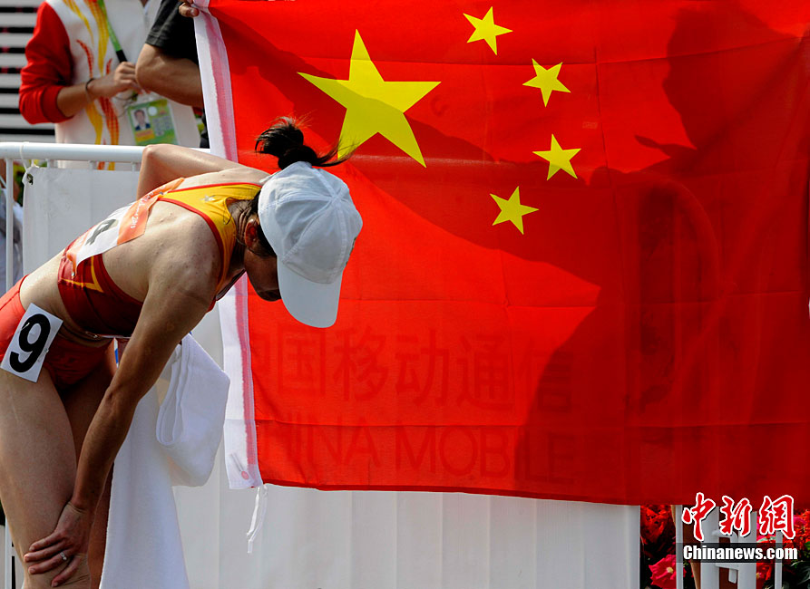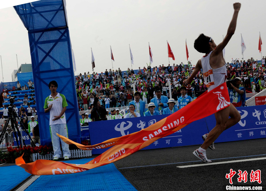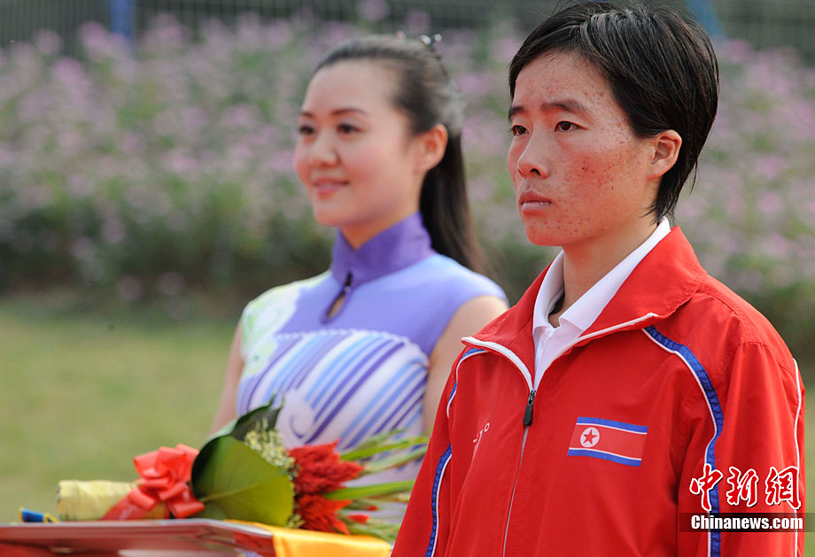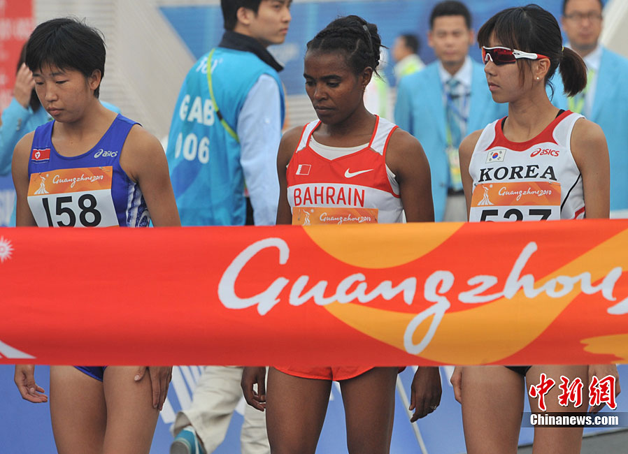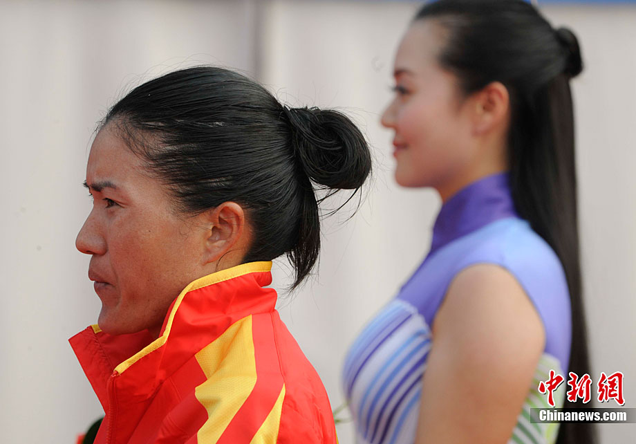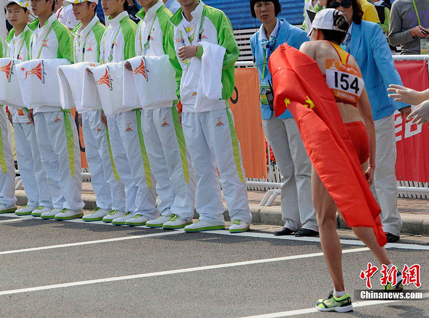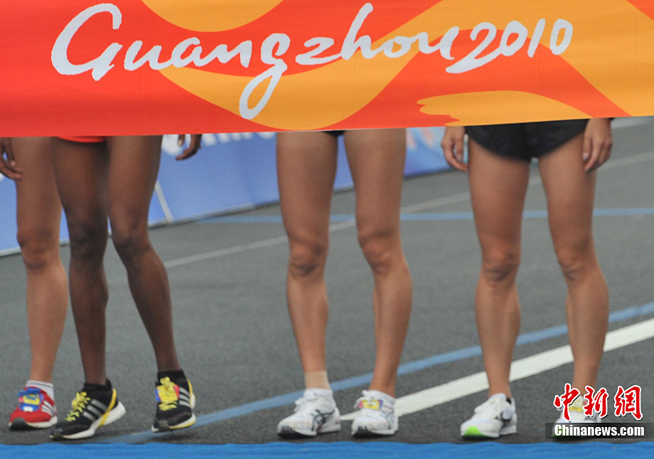 11月27日,中國飛毛腿名將周春秀以2小時25分00秒的賽季最佳成績,奪得廣州亞運(yùn)會女子馬拉松金牌。另一名中國選手朱曉琳獲得銀牌,朝鮮選手金琴玉得到銅牌。中新社記者 賈國榮 攝