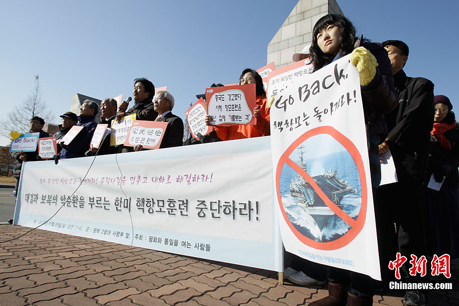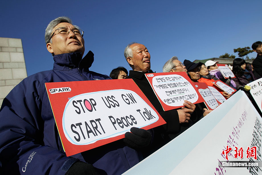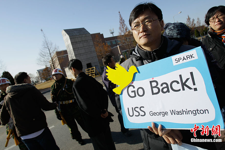 11月28日,韓國(guó)民眾在韓國(guó)軍事基地前舉行示威游行活動(dòng),譴責(zé)美國(guó)派遣航母參加美韓聯(lián)合軍演。這些民眾表示反對(duì)美國(guó)“喬治·華盛頓”號(hào)航母進(jìn)入韓國(guó)領(lǐng)土,并與韓國(guó)軍方舉行軍事演習(xí)。