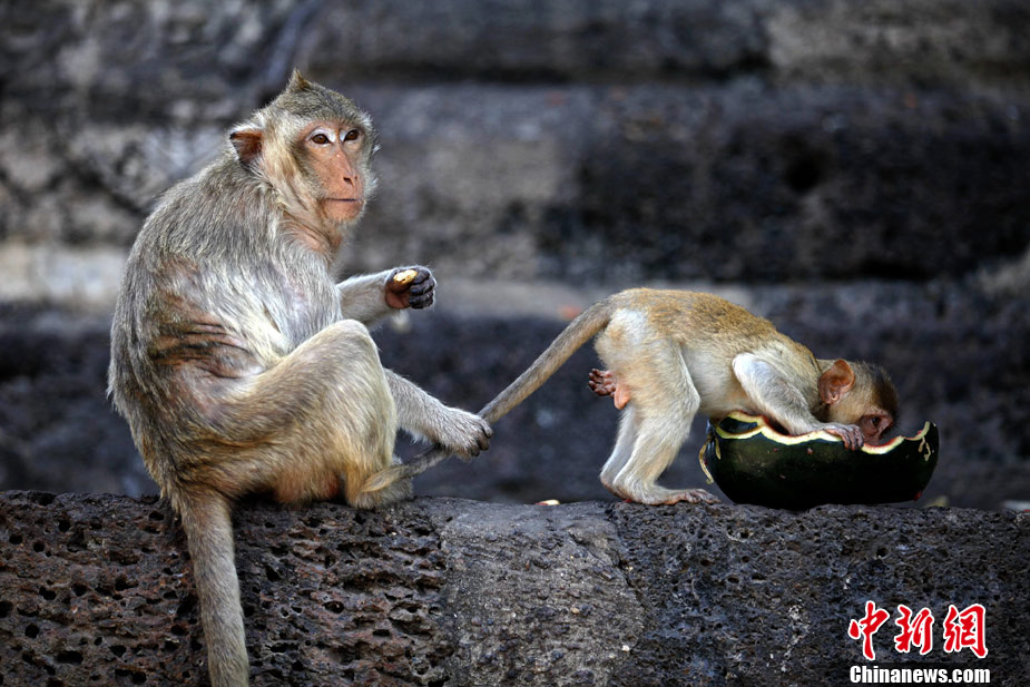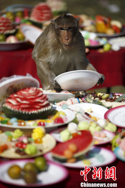 11月28日,泰國華富里,一年一度的“猴子的宴會(huì)”活動(dòng)在當(dāng)?shù)嘏e行。猴子們可以盡情享用超過4000公斤的水果和蔬菜。華富里以猴子眾多聞名,猴子們每年都為當(dāng)?shù)匚齺泶罅坑^光客。