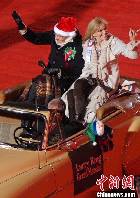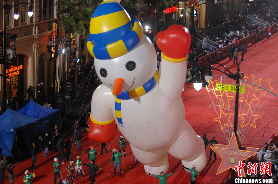 11月28日晚,一年一度的好萊塢迎圣誕大游行在好萊塢大道隆重舉行。CNN王牌主播拉里·金擔(dān)任今年游行的大禮官,在他的率領(lǐng)下,近60名好萊塢明星和14個樂隊、8個騎馬方陣、巨型充氣卡通、花車等游行隊伍依次通過紅地毯,為洛杉磯迎圣誕活動拉開大幕。好萊塢迎圣誕大游行始于1928年,至今已有80多年歷史。中新社發(fā) 張煒 攝