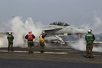 韓美聯(lián)合軍演11月29日進入第二天,兩國軍隊繼續(xù)展開航母大隊訓練和海上防御等高強度軍演。圖為F/A-18E超級大黃蜂戰(zhàn)機從“喬治·華盛頓”號航母甲板上起飛。