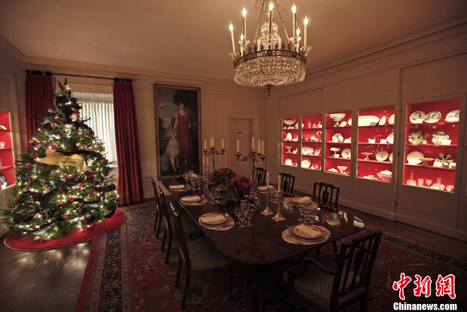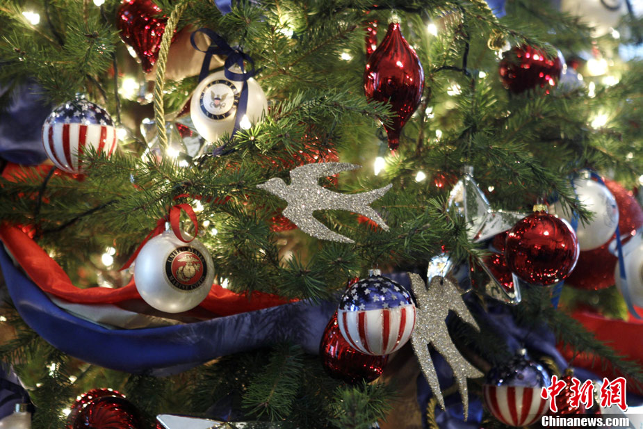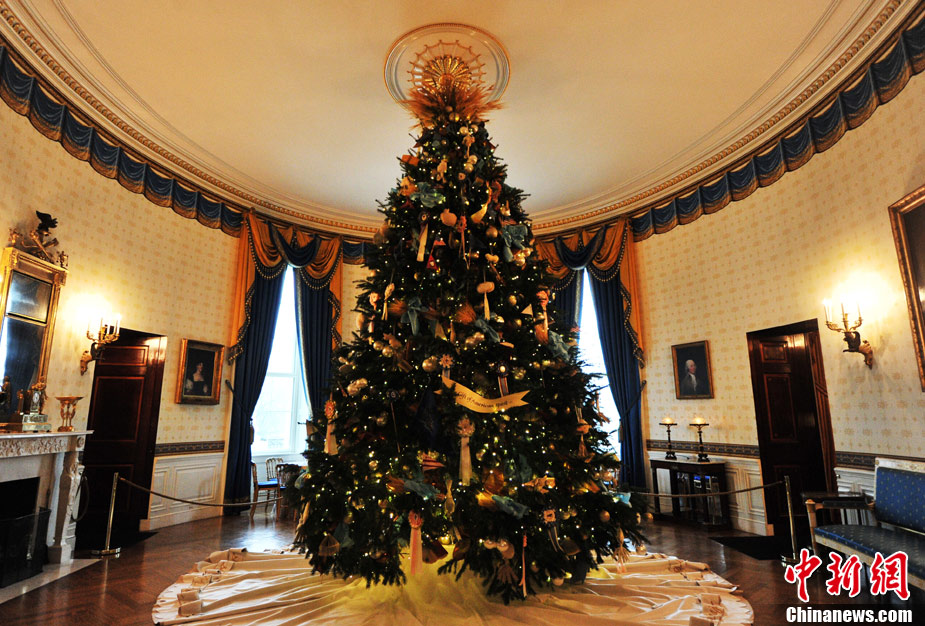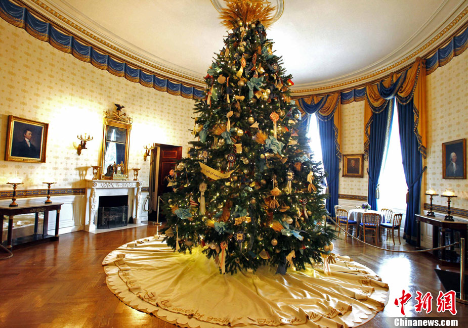 12月1日,美國華盛頓,白宮圣誕樹亮相藍(lán)廳,今年的裝飾主題是“簡單禮物”。