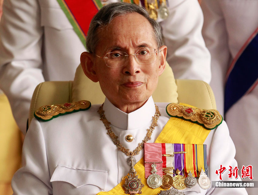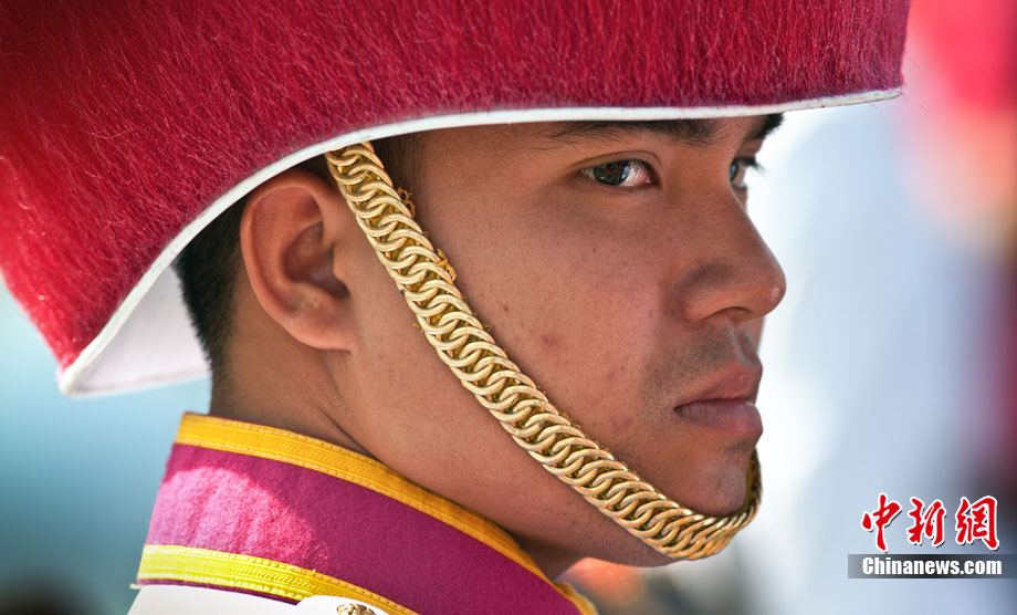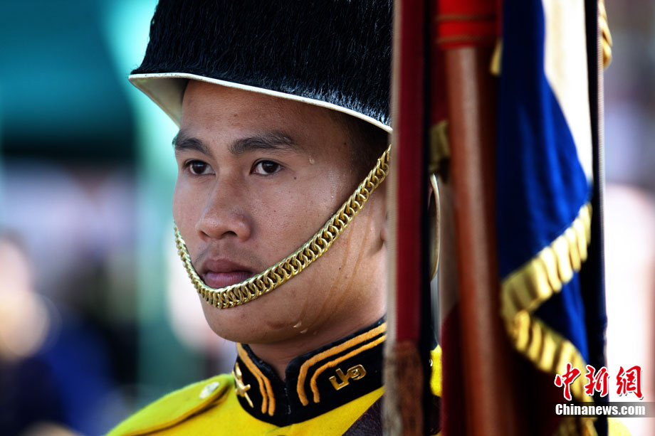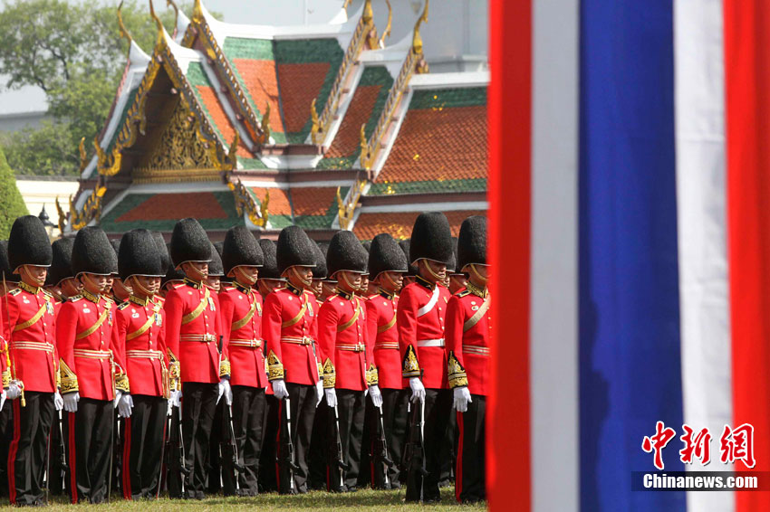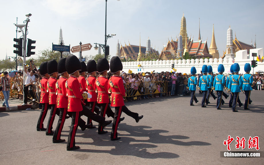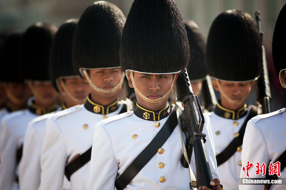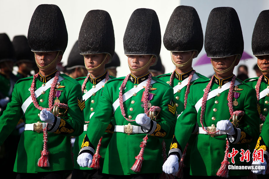 當(dāng)?shù)貢r(shí)間12月5日,泰國各界齊聚曼谷市中心的大王宮,慶祝泰王普密蓬83歲大壽。泰國皇家衛(wèi)隊(duì)士兵身著紅、綠、黑、蘭等各種顏色的軍服進(jìn)行游行,為泰王慶祝生日。
