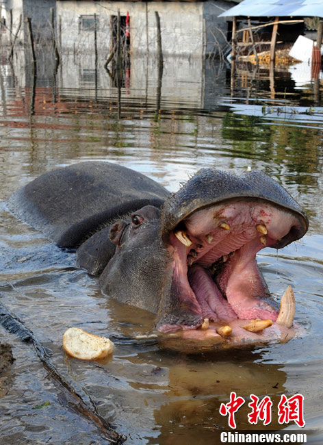 巴爾干半島西部連日來頻遭大雨侵襲,造成波斯尼亞和黑塞哥維那、塞爾維亞、黑山和阿爾巴尼亞的許多地區(qū)洪水泛濫,數(shù)千人被迫撤離家園。圖為6日,在黑山的普拉夫尼察,一頭從動物園中逃出的河馬在洪水中游泳。
