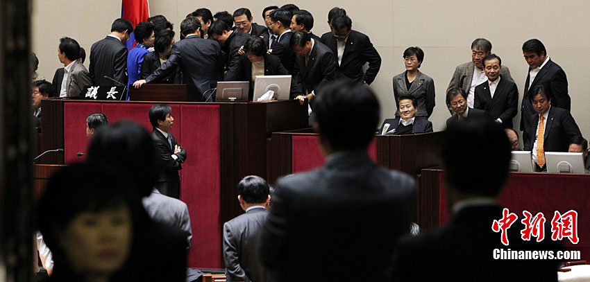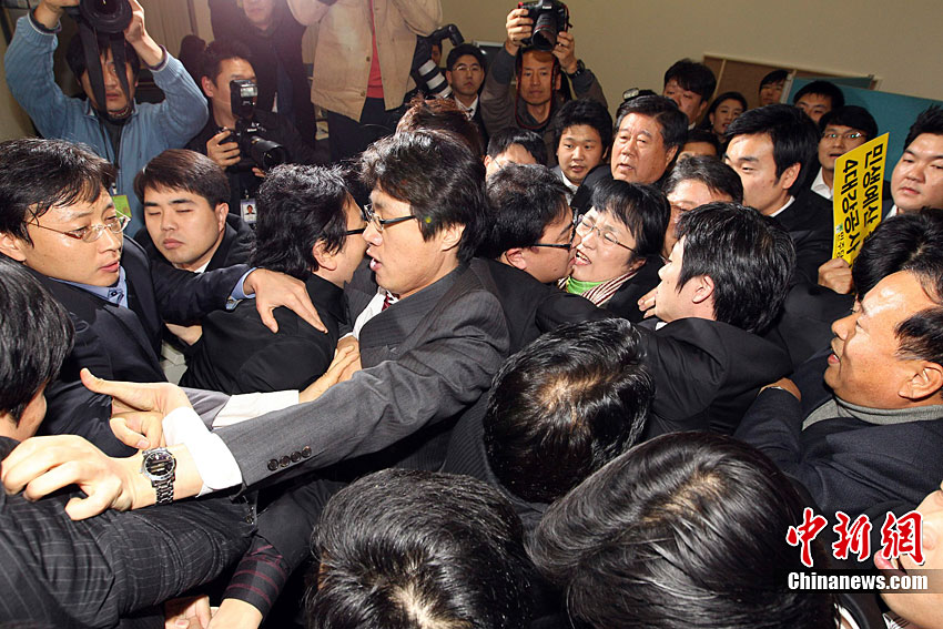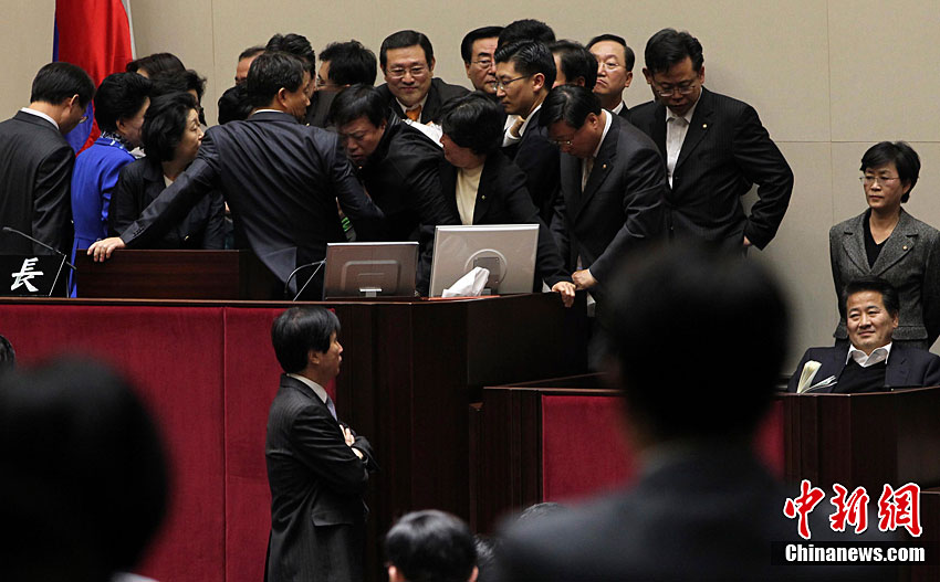 當(dāng)?shù)貢r間12月7日,韓國首爾國民議會大廳內(nèi),朝野議員再度爆發(fā)肢體沖突。據(jù)悉,本次議會會議的議題是2011年國家預(yù)算計劃案問題。