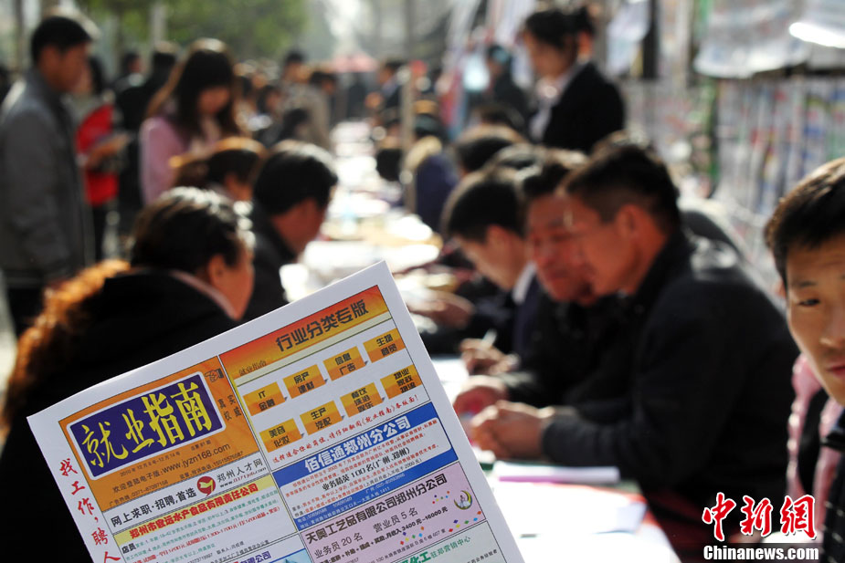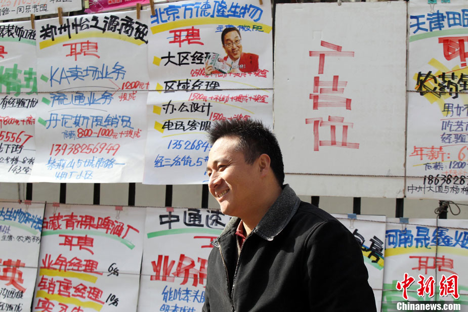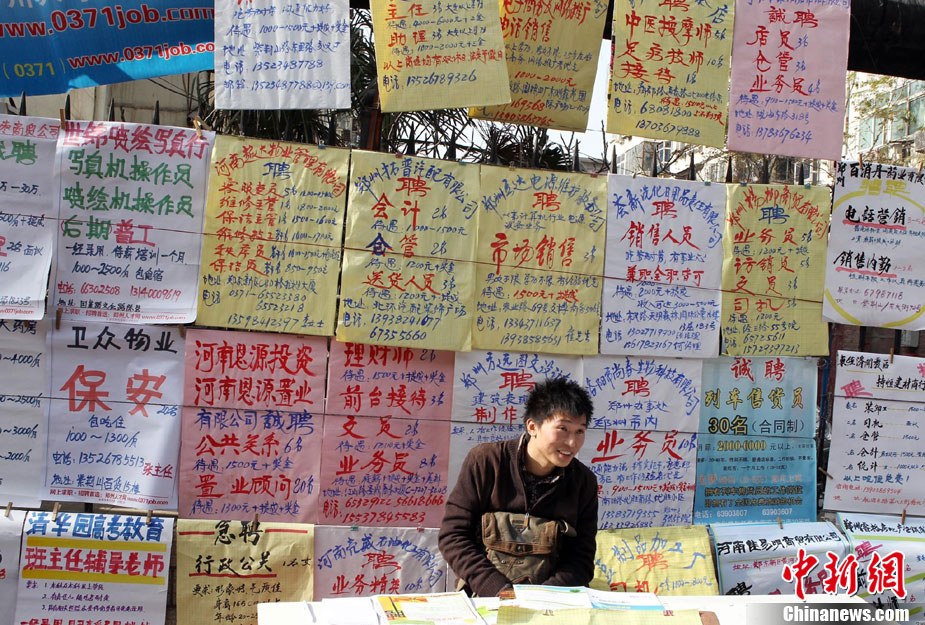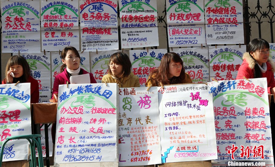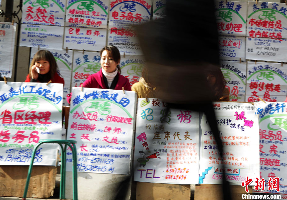 12月11日,年終歲末,在河南省人才市場的馬路上招牌用工者的美女招聘者坐成排等候應(yīng)聘者前來咨詢。許多企業(yè)反映,每到年底都有部分員工請假回家相親結(jié)婚或與家人團聚過年,造成工廠人手不夠。