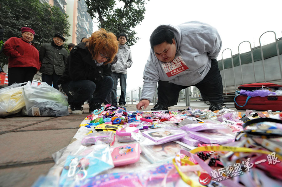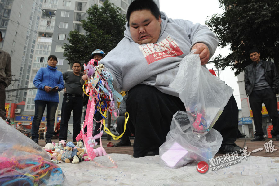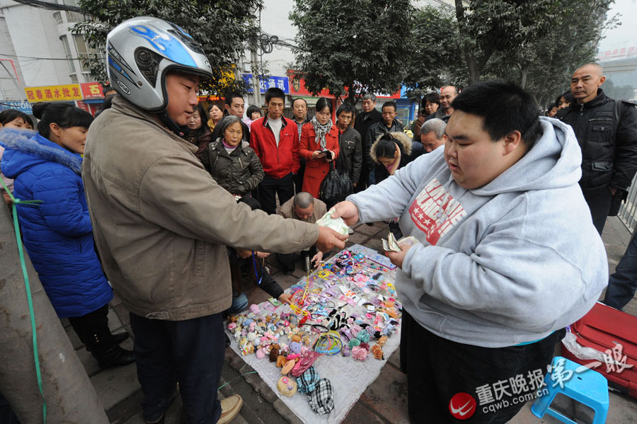 “走,出去擺哈地?cái),活?dòng)一下!”吃過(guò)午飯后,梁用打開病房的衣柜,提出一大包鑰匙鏈、手機(jī)鏈、耳環(huán)、頭花等小飾品。梁用的出現(xiàn),猶如明星一般,“看,又是哪個(gè)胖娃!”不少人圍了過(guò)來(lái)。記者守候了半個(gè)多小時(shí),發(fā)現(xiàn)大多顧客并非沖著飾品而來(lái),而是被梁用巨大的體型吸引來(lái)的。