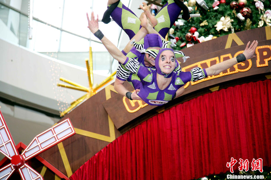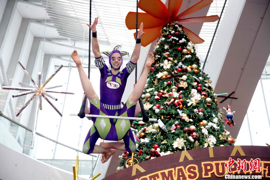 12月14日,香港國(guó)際金融中心上演震撼視覺(jué)的高空特技。首次來(lái)港獻(xiàn)藝的美國(guó)著名雜技團(tuán)D Squared Trapeze在圣誕樂(lè)園內(nèi)打造雙人空中秋千,凌空飛舞表演,帶給觀眾“飛一般”夢(mèng)幻體驗(yàn)。中新社發(fā) 洪少葵 攝