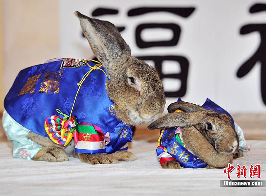 當(dāng)?shù)貢r(shí)間12月16日,位于韓國(guó)京畿道龍仁市的愛寶樂園展出數(shù)只穿著傳統(tǒng)民族服飾“韓服”的兔子,迎接即將到來的兔年。