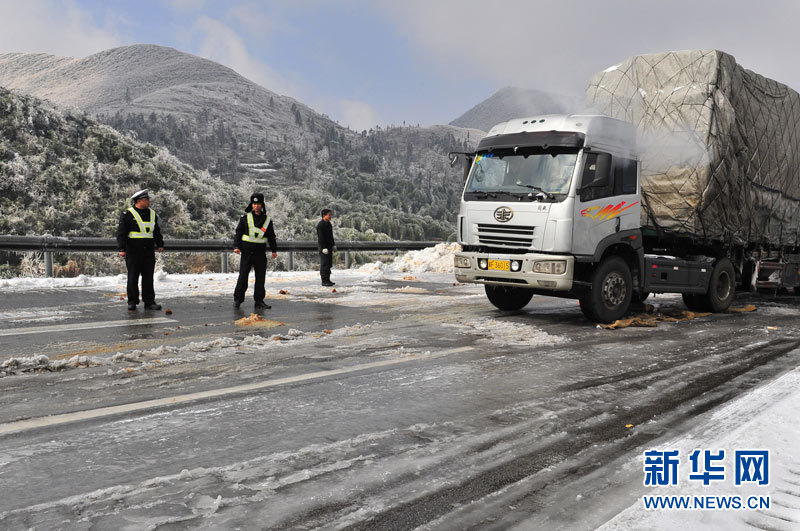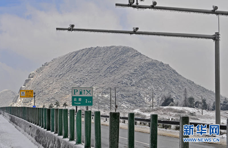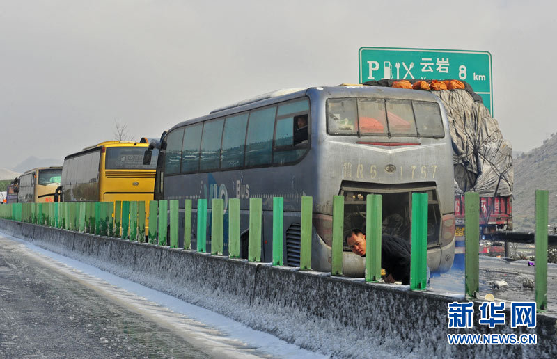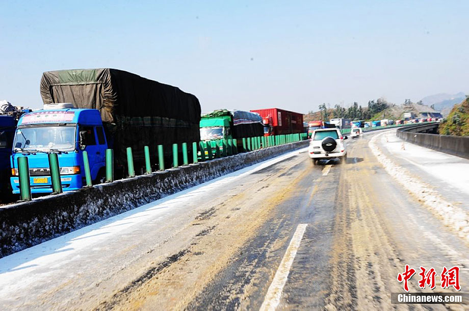 受強(qiáng)冷空氣南下影響,廣東北部山區(qū)氣溫降至零下,境內(nèi)的京港澳高速乳源段和坪乳公路路面結(jié)冰,交通從12月16日凌晨開(kāi)始中斷,大量車輛滯留。經(jīng)全力抗冰搶險(xiǎn),相關(guān)路段于16日14時(shí)許恢復(fù)正常通行。17日,已搶通的京港澳高速公路粵北段路面再次結(jié)冰,車輛滯留10公里。李凌 攝