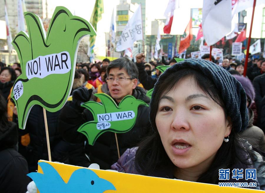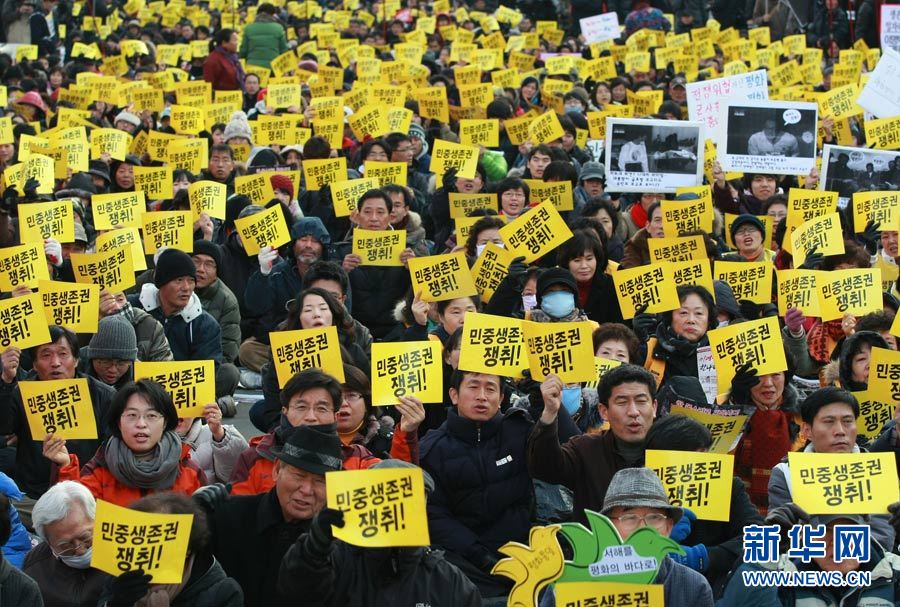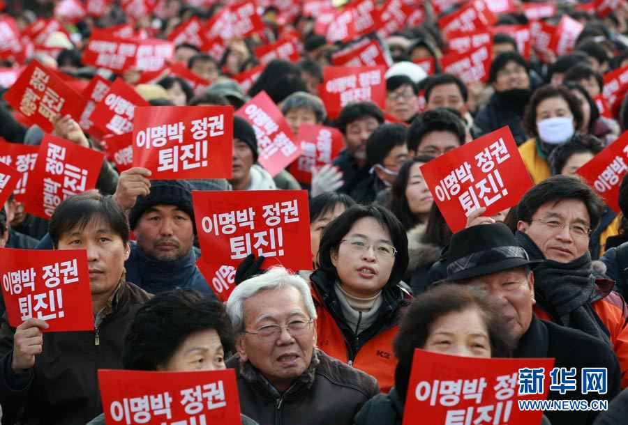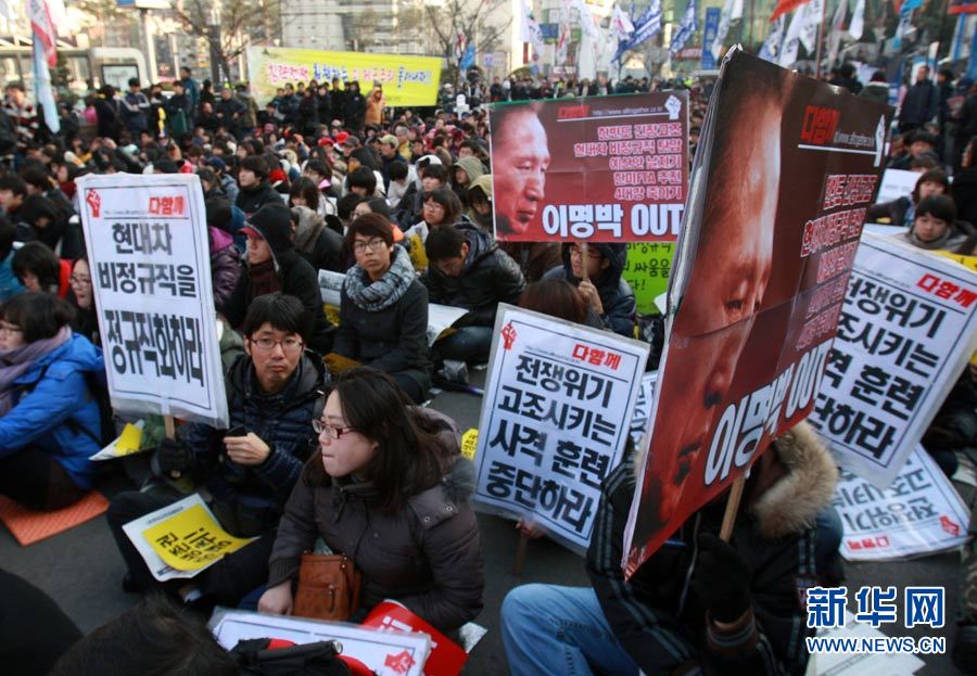 12月18日,在韓國首爾火車站,人們手舉標語,高喊口號,要求李明博政府下臺。當日,數(shù)千名韓國民眾在首爾舉行抗議,要求李明博政府下臺。韓國政府16日宣布將在18日至21日之間的某一天在延坪島海域舉行海上實彈射擊訓練。樸真熙攝 圖片來源:新華網(wǎng)