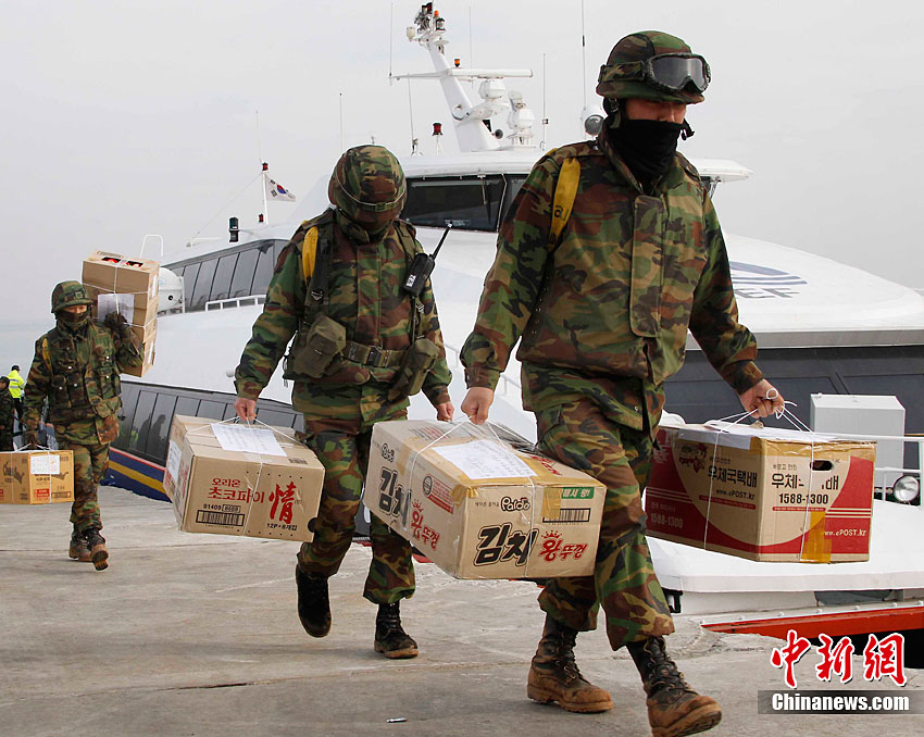 12月21日,韓國,居民和士兵乘船抵達(dá)延坪島港口。當(dāng)日,仁川港前往延坪島的航線重開。圖為復(fù)航后首艘民用船只抵達(dá)延坪島。