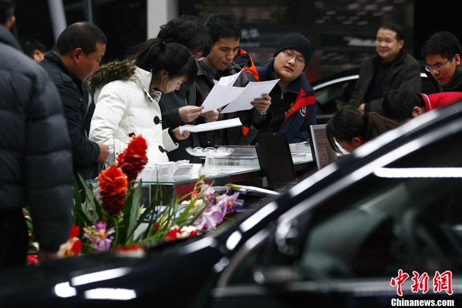 12月23日夜,北京民眾連夜排隊購置新車。當日下午,北京市人民政府新聞辦公室召開“北京交通改善措施”新聞發(fā)布會,正式公布了《關(guān)于進一步推進首都交通科學發(fā)展 加大力度緩解交通擁堵工作的意見》,將實行綜合措施治理交通擁堵。其中,2011年度北京小客車總量額度指標控制為24萬個,牌照通過搖號無償分配的政策成為民眾關(guān)注的焦點。中新社記者 富田 攝