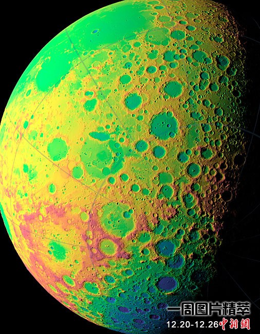近日,美國航天局對(duì)外公布了月球勘測軌道飛行器攜帶的月球軌道飛行器激光測高儀(LOLA)對(duì)該地點(diǎn)進(jìn)行的高度測量?茖W(xué)家稱,月球勘測軌道飛行器使研究者能制造出最精確且最完整的月球地形圖。紅色代表月球最高點(diǎn),藍(lán)色代表最低點(diǎn)。