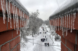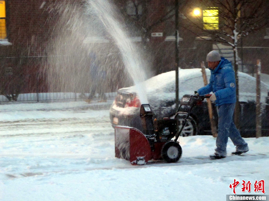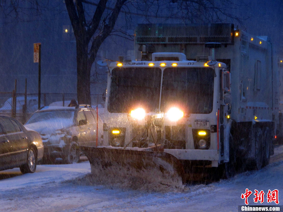 一場暴風雪26日撲向美國東北部的新澤西州、紐約市等地,同時伴有時速達到四五十哩的勁風,預計26日及27日為這些地區(qū)帶來十英寸左右的積雪。公路行車危險大增,卷起的漫天白雪可能造成航班嚴重誤點,導致華盛頓、紐約和波士頓機場近日取消航班。圖為紐約法拉盛街頭掃雪車正在清理公路積雪。中新社記者 孫宇挺 攝