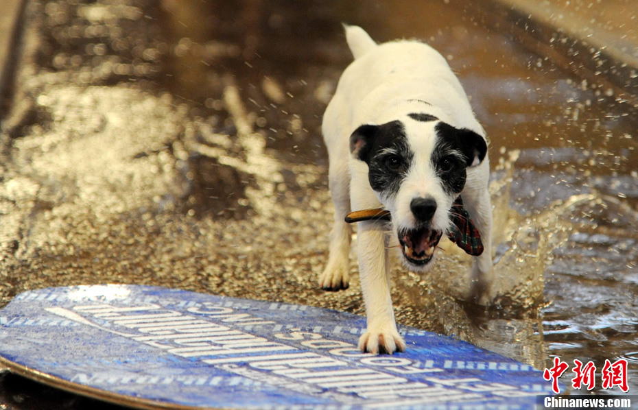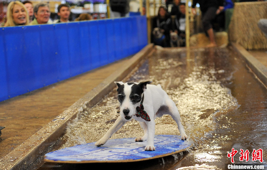 美國一家寵物食品公司推出的新年花車12月29日獲得吉尼斯認(rèn)證,成為世界上最重的單體花車;ㄜ嚳傊剡_(dá)到35噸,其中包括約15噸水。這輛花車將參加2011年元旦舉行的第122屆美國玫瑰花車大游行,屆時十只寵物狗將在花車上表演沖浪、跳水等高難度動作。圖為寵物狗沖浪彩排。中新社發(fā) 張煒 攝