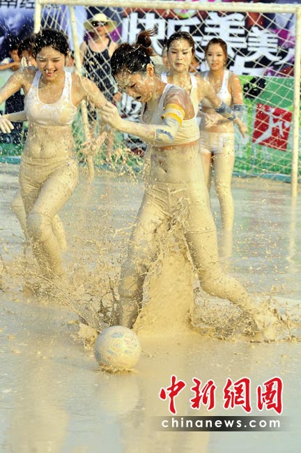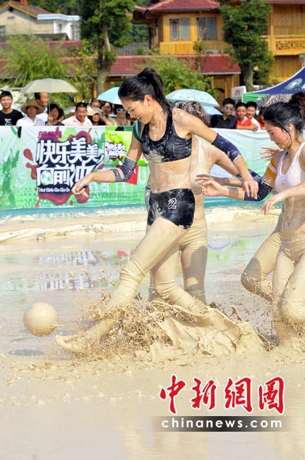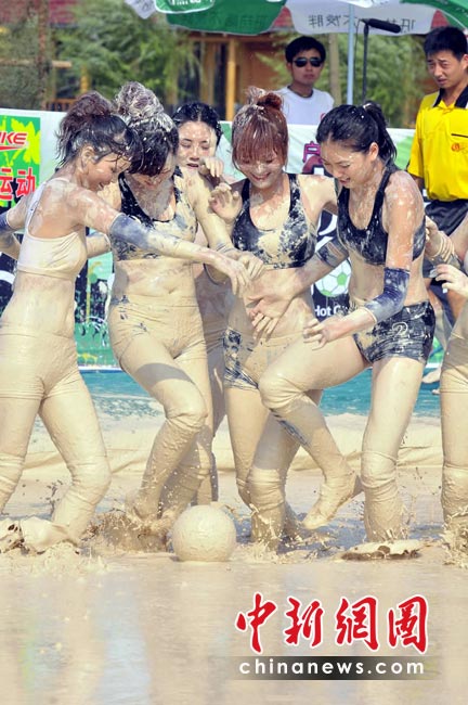 南非世界杯戰(zhàn)火越燃越烈,各地的世界杯熱潮也席卷而來。近日,一檔比基尼美女足球賽在長沙開鑼,和世界杯男足不同的是,美女們是在泥漿中比賽。據(jù)悉,這檔名為《快樂美美向前沖》的足球賽已在湖南經(jīng)視播出。節(jié)目中,為了順利闖關(guān),眾美女不顧形象,在泥漿中匍匐前進和翻滾,引得觀眾爆笑如雷。圖為首場比賽中,湖南隊美女與湖北隊美女在連闖四關(guān)后,進入泥漿場內(nèi)進行終極球賽PK。湖南經(jīng)視供圖