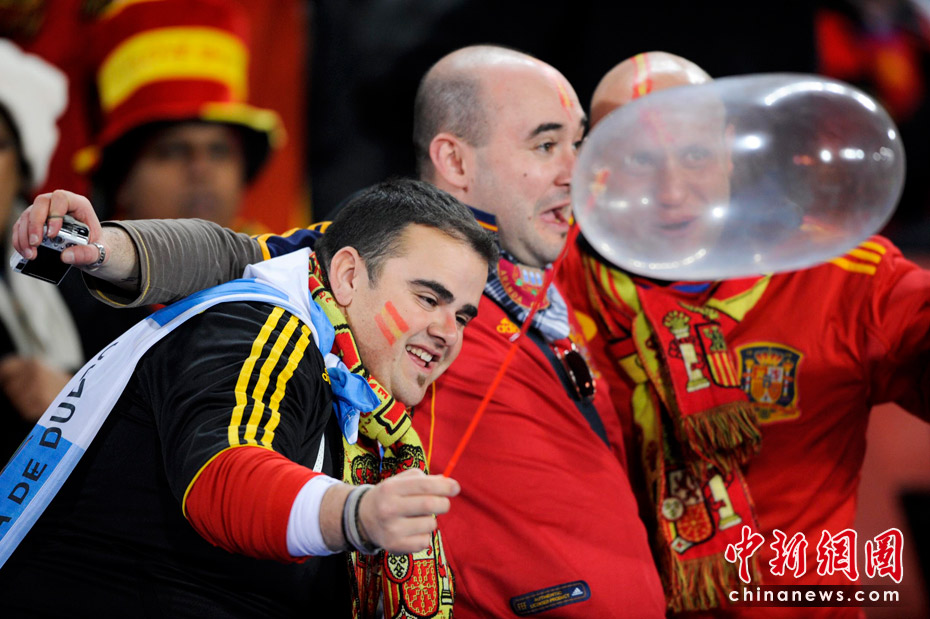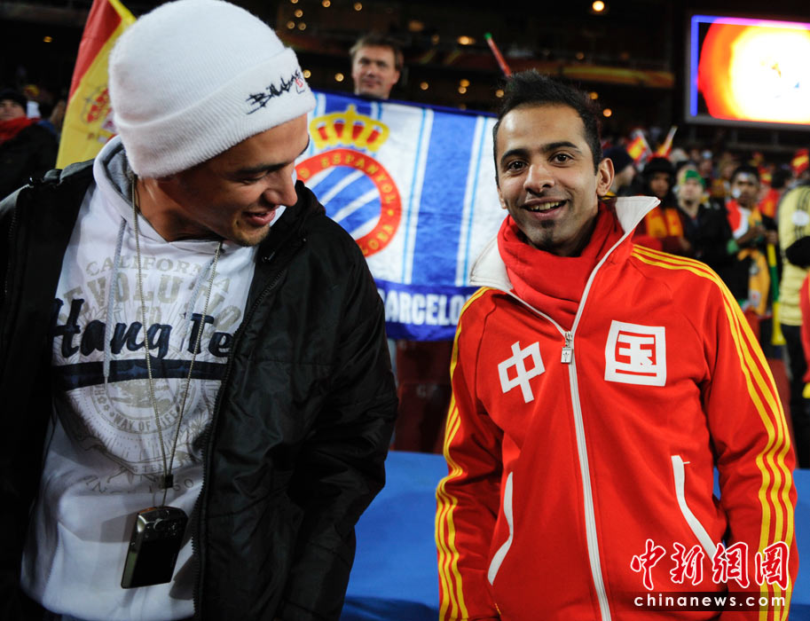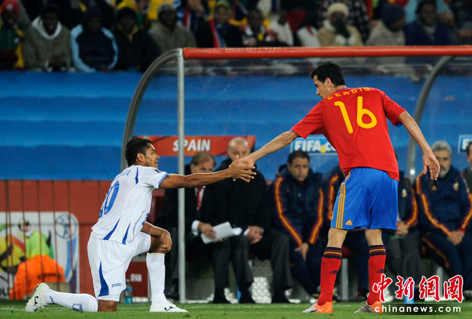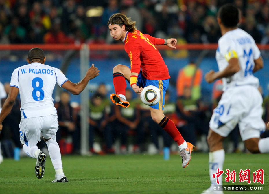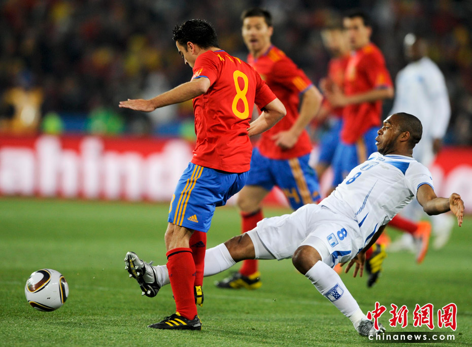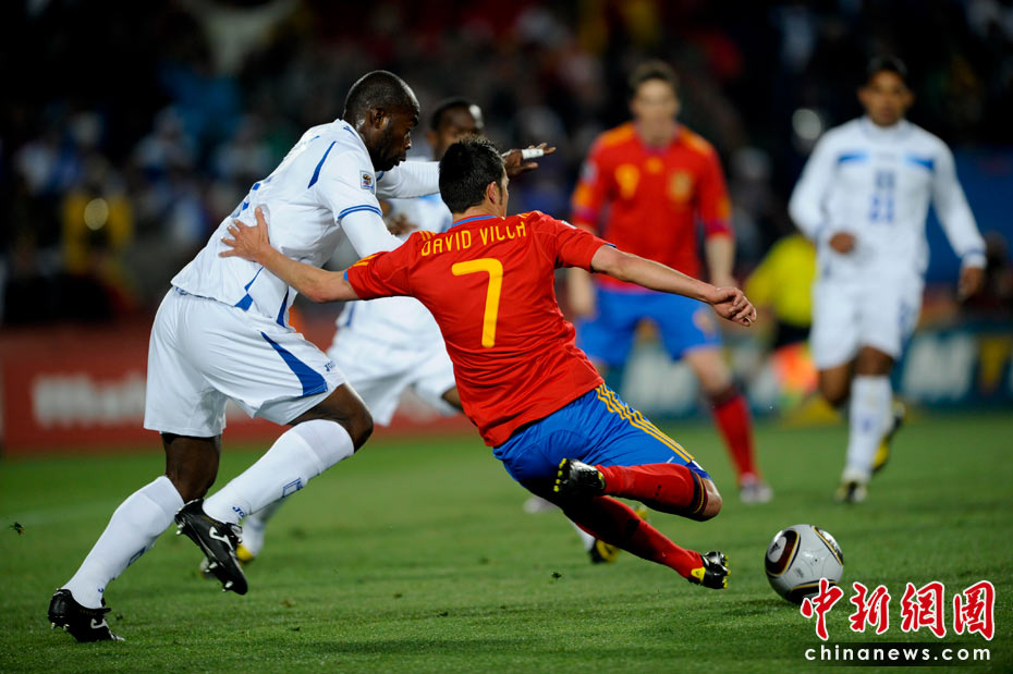 當(dāng)?shù)貢r(shí)間6月21日晚,南非世界杯小組賽第二輪西班牙對洪都拉斯的比賽在約翰內(nèi)斯堡埃利斯公園體育場展開激烈的爭奪,最終西班牙2比0擊敗洪都拉斯 。 中新社記者 廖攀 攝