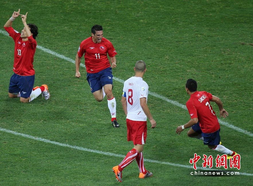 6月21日,世界杯H組第2輪首戰(zhàn)在伊麗莎白港納爾遜-曼德拉灣球場展開較量。瑞士中場貝赫拉米連續(xù)肘擊兩人,被紅牌罰下后,以十人應(yīng)戰(zhàn)的他們在下半場被智利隊(duì)岡薩雷斯打入一球,以0-1告負(fù)。