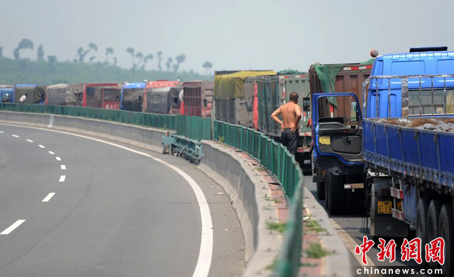6月21日,施工20天的110國(guó)道延慶縣境內(nèi)的四座橋梁維修完畢,道路恢復(fù)暢通,但擁堵了20多天的京新高速,緩解情況卻不大。幾小時(shí)走上兩三公里的速度,實(shí)在讓人難以忍受,但長(zhǎng)期跑這趟線路的大貨車車司機(jī)稱,車能走動(dòng),就已經(jīng)慶幸了,僅僅10幾公里的路,被堵三天三夜的情況以前是經(jīng)常出現(xiàn)。圖為23日在滯留的車隊(duì)中,不斷有開(kāi)著摩托車的小販在大貨車之間穿插以做點(diǎn)生意。王苡萱/CFP
