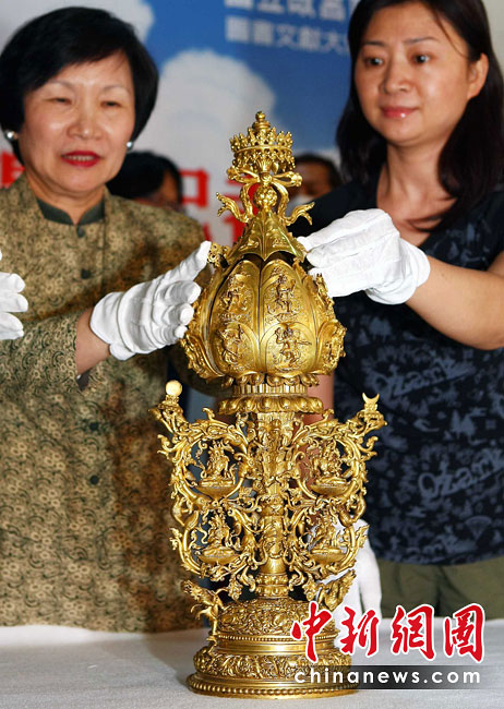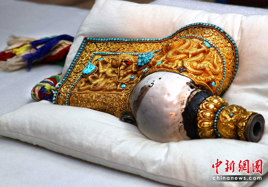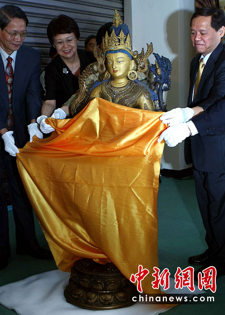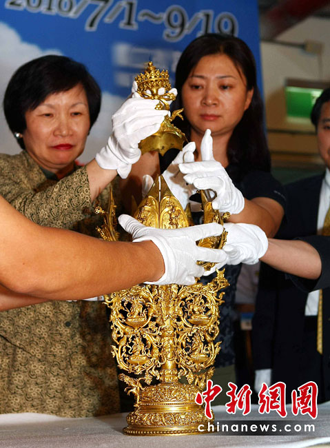 6月25日,工作人員將“鎏金銅彌勒菩薩像”、“金翅白海螺法號”、“八瓣蓮花曼荼鑼”等3件重量級文物開箱。7月1日,臺灣故宮博物院將舉辦“圣地西藏---最接近天空的寶藏”特展,展覽分“吐蕃王朝”、“金色寶藏”、“文化交流”、“雪域風(fēng)情”四部分,共有130組件文物參展。中新社記者 宋吉河 攝