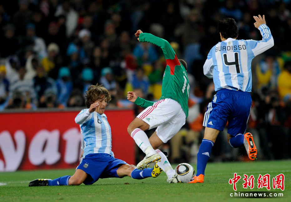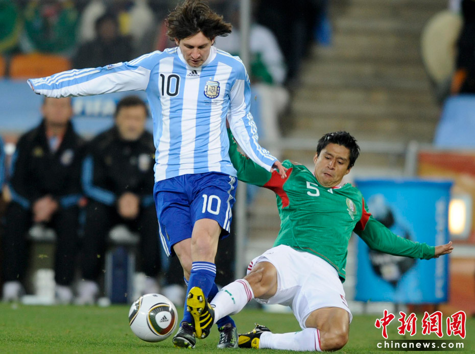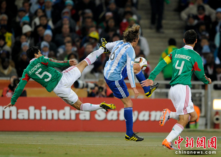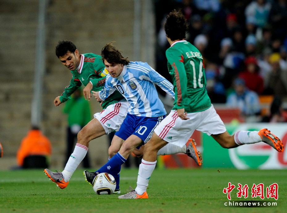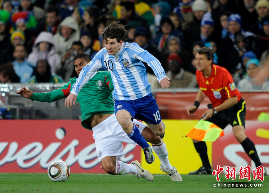 北京時間6月28日凌晨2:30,南非世界杯1/8決賽再賽一場,阿根廷隊在約翰內(nèi)斯堡的足球城球場迎來了墨西哥隊。憑借特維斯一個明顯越位進球首開紀錄,隨后伊瓜因和特維斯各進一球,以3-1擊敗墨西哥,晉級八強。 中新社記者 廖攀 攝