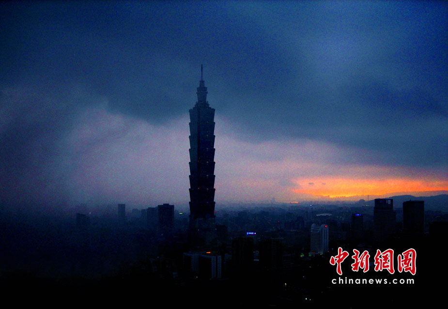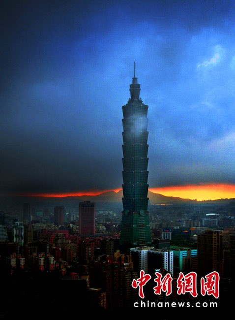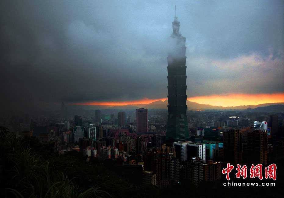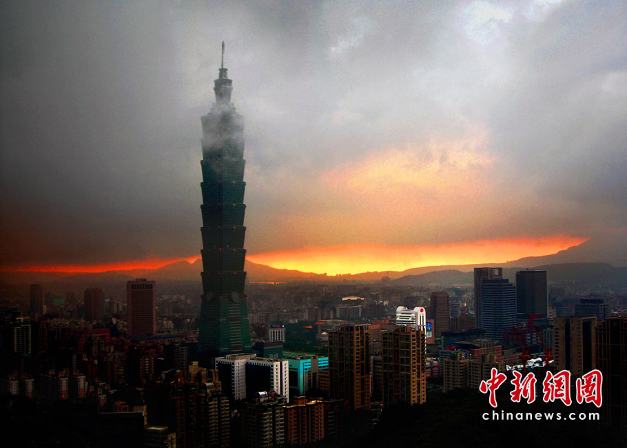6月28日傍晚,臺北市一陣大雨后,從象山俯瞰市區(qū),101摩天大樓聳入云霄,后山紅云如火,景觀如畫。美麗的臺北市地處盆地,氣候多變,夏季的城市景色也時常變幻莫測。中新社記者 宋吉河攝