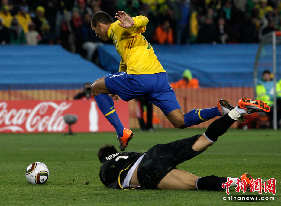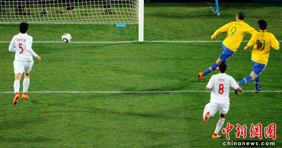 6月29日凌晨2:30,南非世界杯1/8決賽再戰(zhàn)一場。奪冠熱門巴西隊在約翰內斯埃利斯公園球場迎來了南美兄弟智利隊。最終憑借胡安和法比亞諾的在上半場的進球、羅比尼奧下半場錦上添花,巴西隊以3-0淘汰智利,晉級八強。