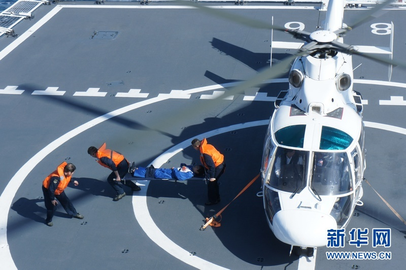 醫(yī)護(hù)人員從直升機(jī)上將“傷員”運(yùn)送至病房。孟彥 攝 圖片來源:新華網(wǎng)