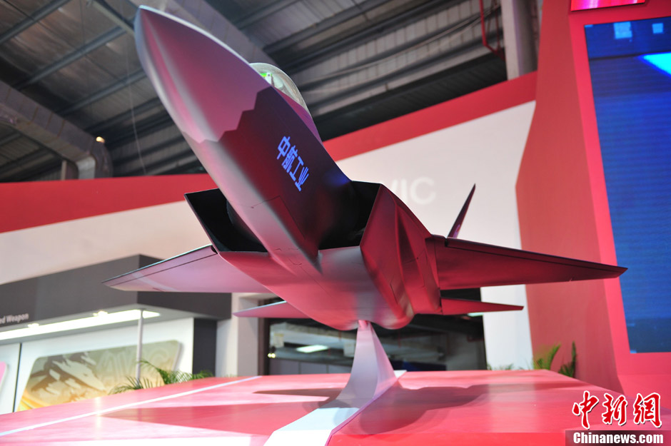 11月13日上午,第九屆中國(guó)國(guó)際航空航天博覽會(huì)在廣東珠海開幕,一架中國(guó)先進(jìn)戰(zhàn)斗機(jī)概念模型在中航工業(yè)展臺(tái)亮相,從外形上看,與前不久成功試飛的殲31相似,備受關(guān)注。中新社發(fā) 柯小軍 攝